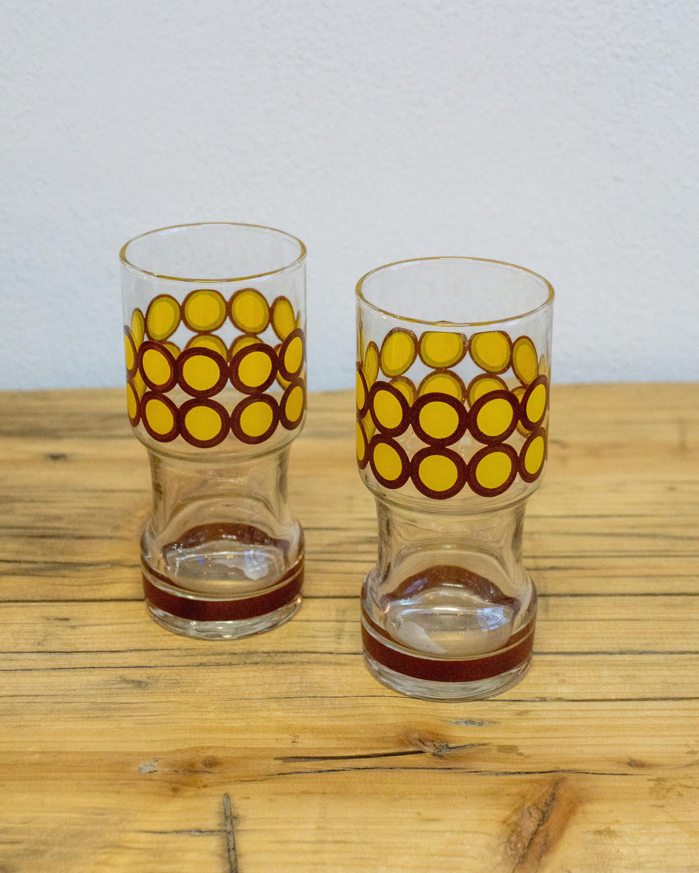 Coppia di bicchieri originali degli anni ’80 in colore giallo con decoro a pois. Design vivace e tipico dello stile del periodo.