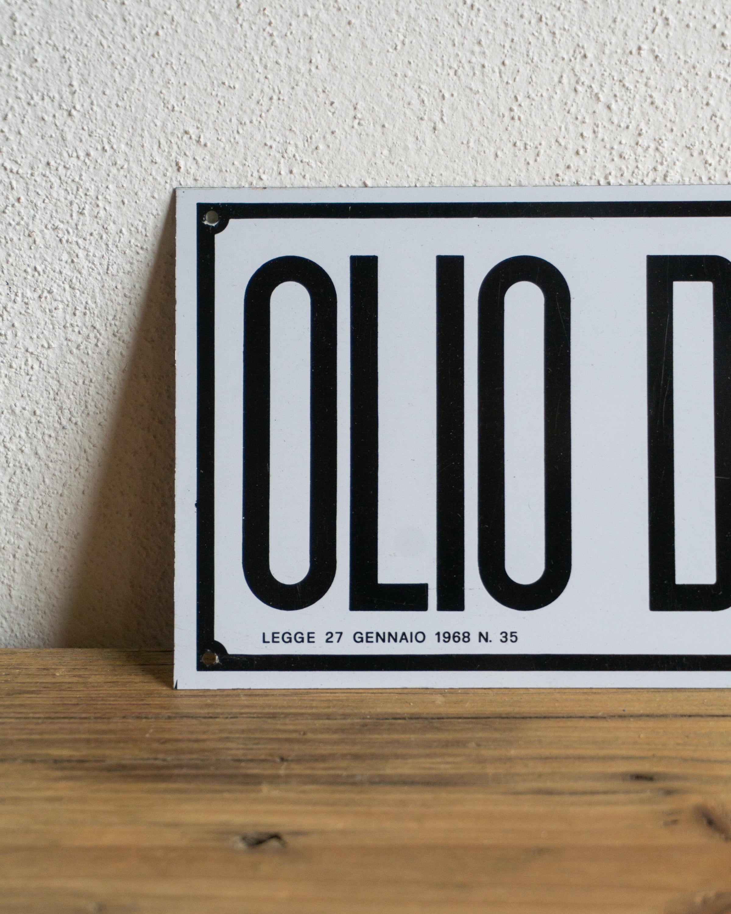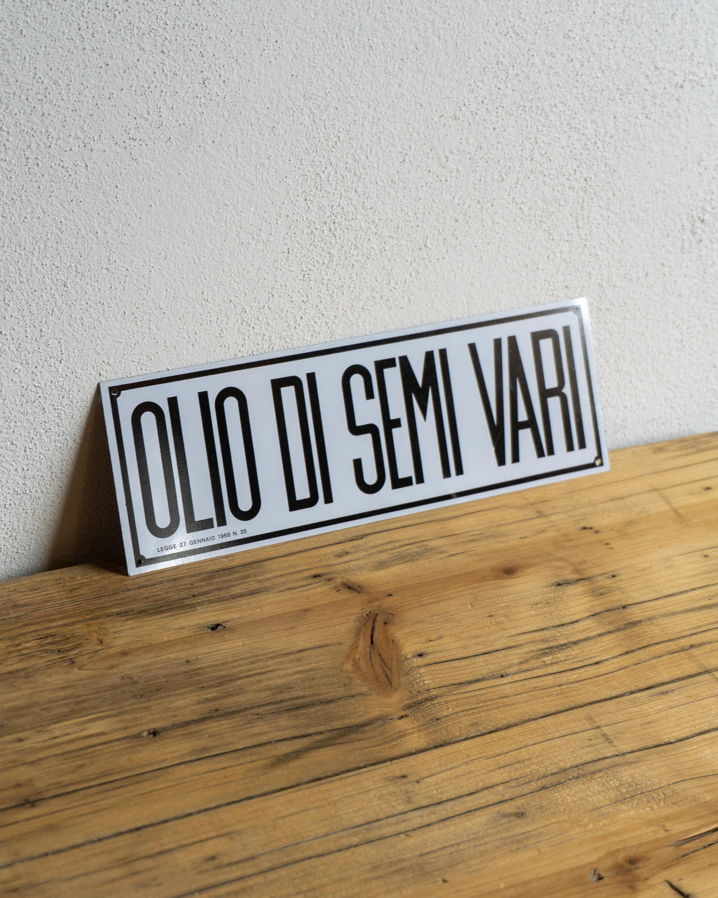 Insegna pubblicitaria Olio di Semi Vari, proveniente da un negozio di alimentari. Realizzata in metallo smaltato con grafica tipica del periodo.