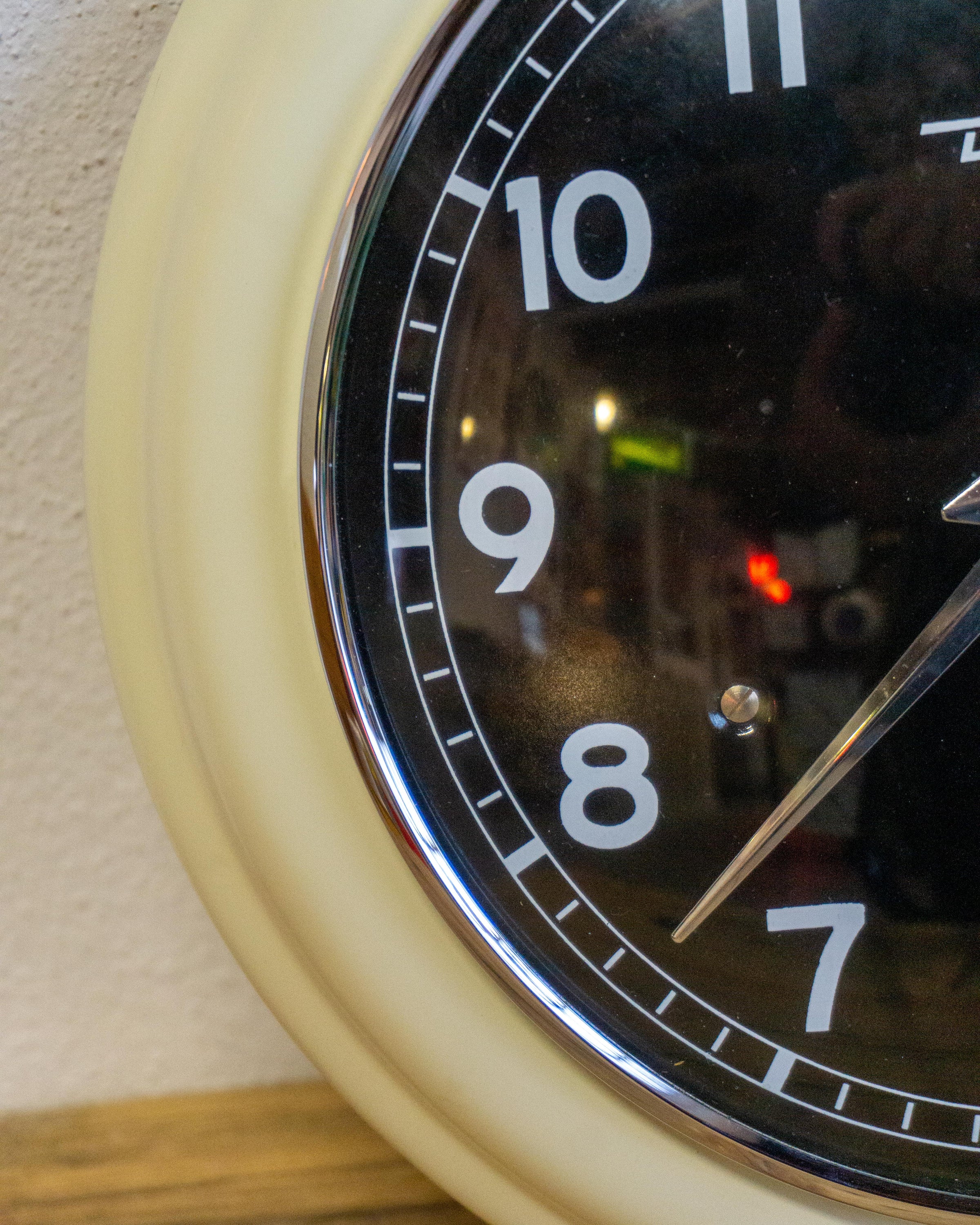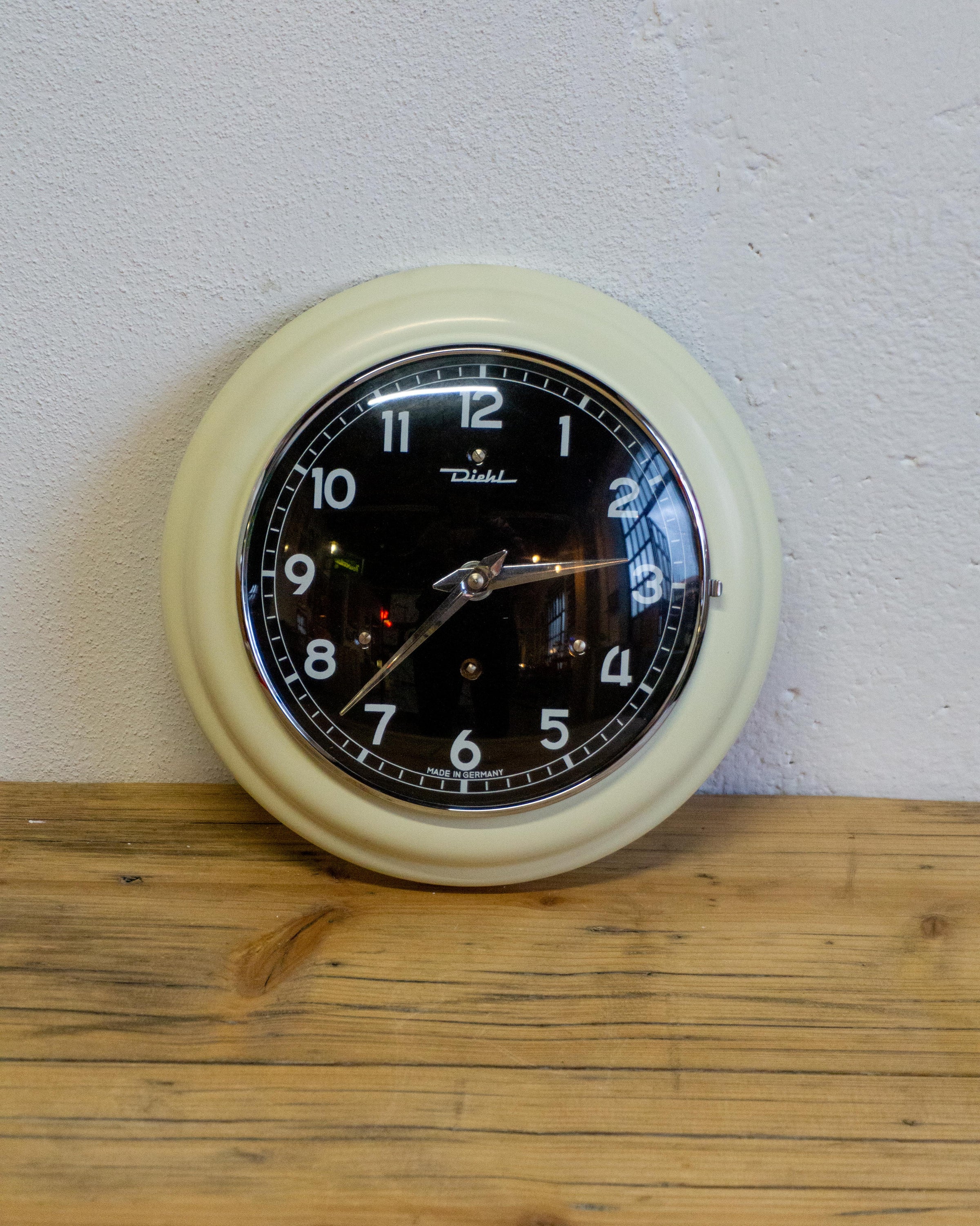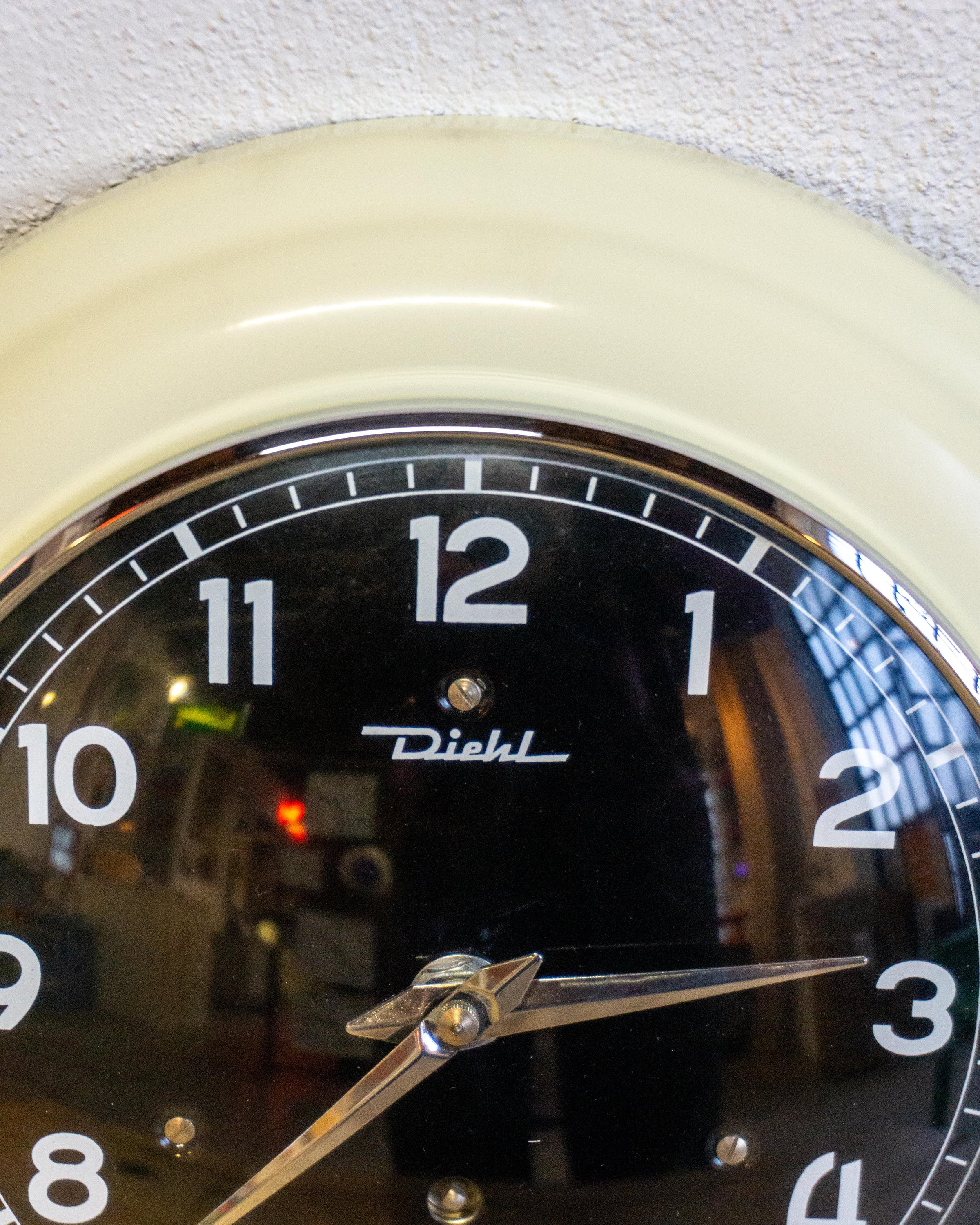 Orologio da parete Diehl in metallo con vetro e sfondo nero – anni ’60