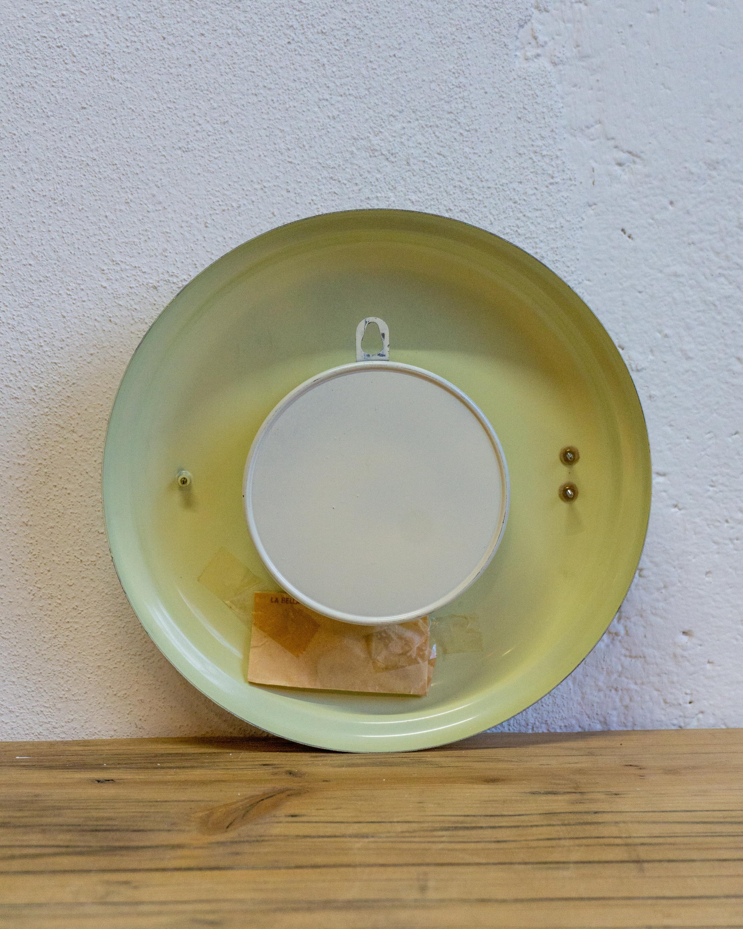 Orologio da parete Diehl di produzione tedesca, realizzato negli anni ’60. Struttura in metallo con vetro frontale e quadrante nero dal forte contrasto visivo, tipico dello stile modernista del periodo. Misura 24 cm di diametro e monta un meccanismo a carica manuale recentemente revisionato.