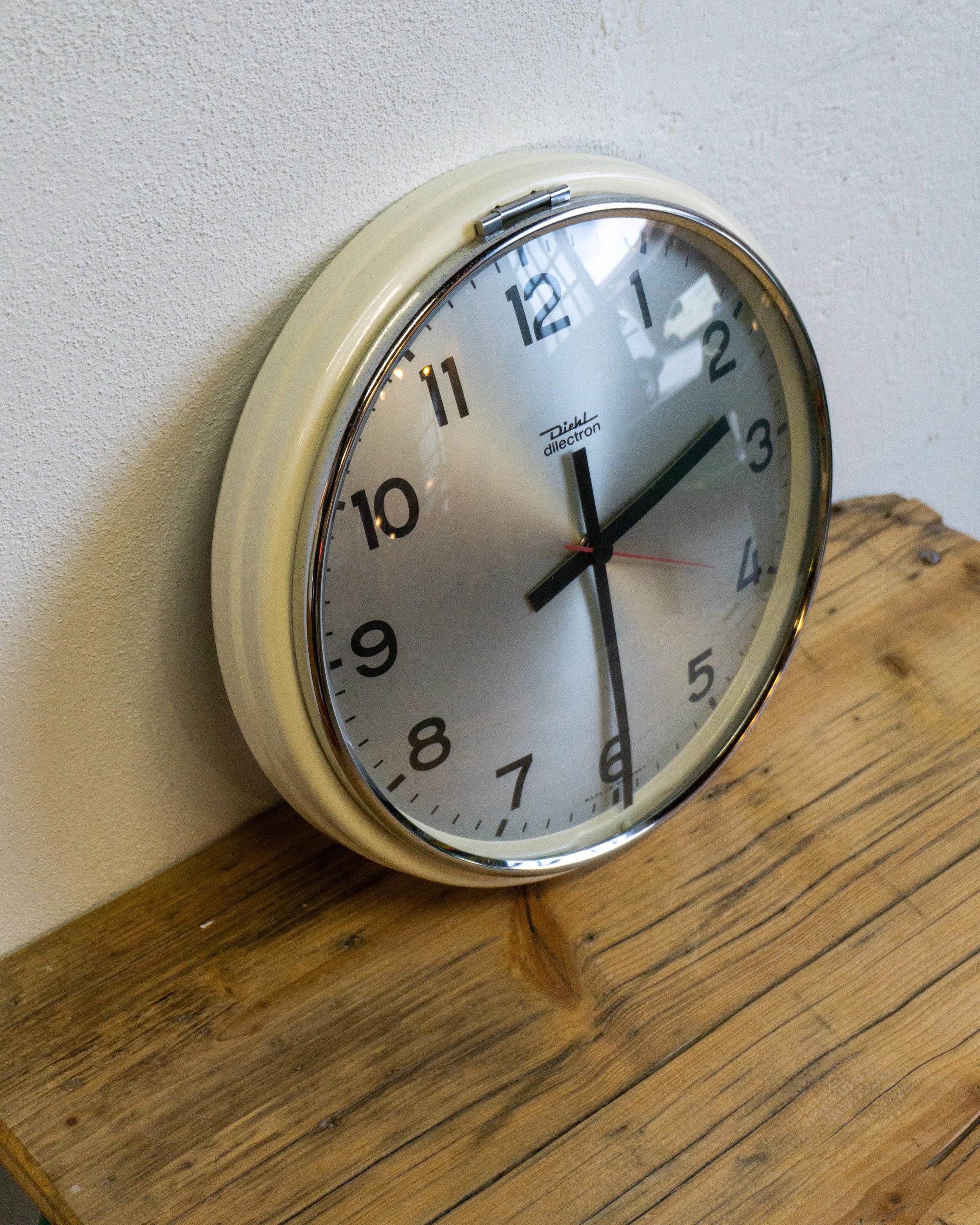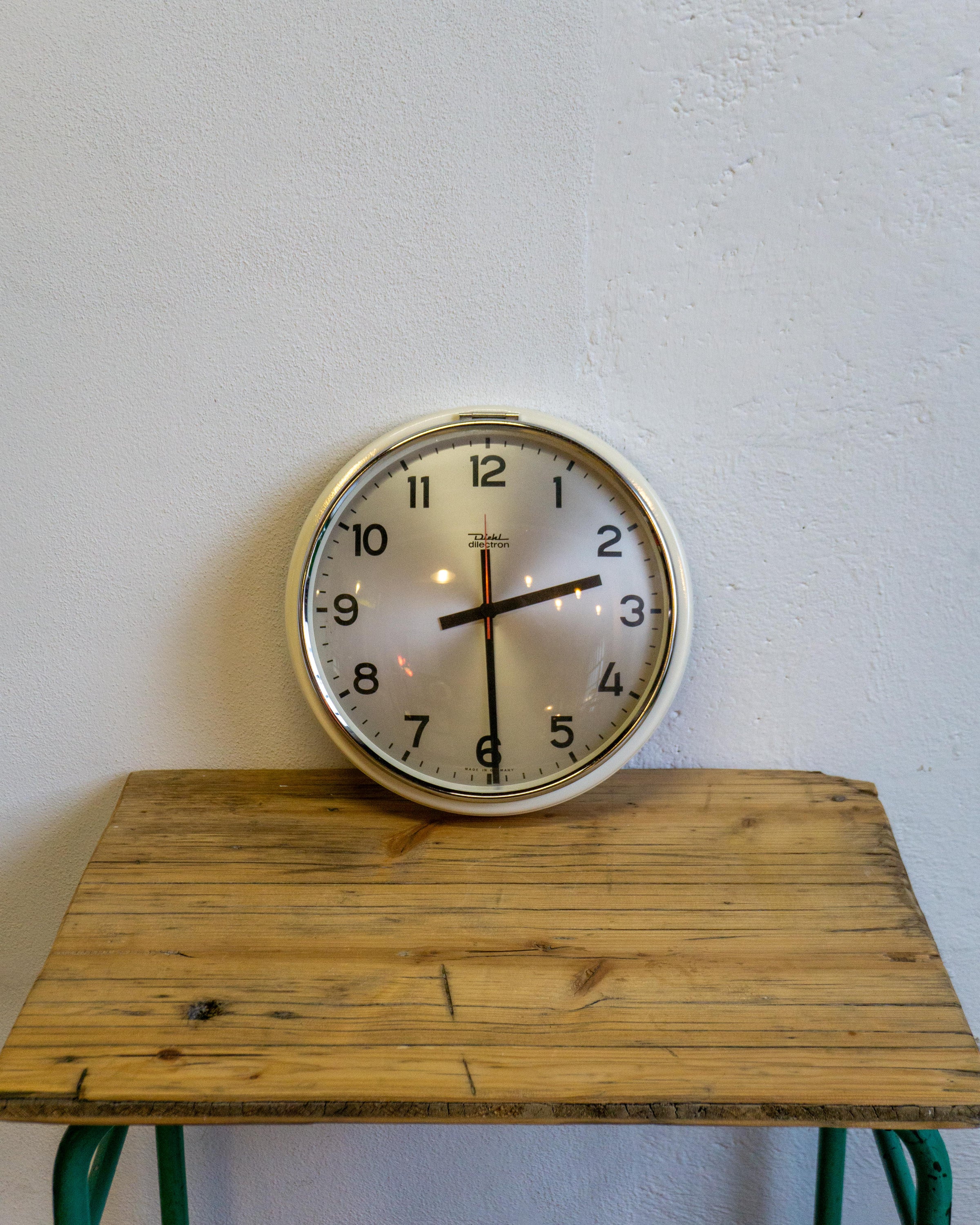 Orologio da parete Diehl originale di produzione tedesca, risalente agli anni ’60. Realizzato in metallo con vetro frontale, misura 30 cm di diametro. Il design sobrio e funzionale, tipico del modernismo tedesco del periodo, unisce solidità costruttiva e precisione meccanica.