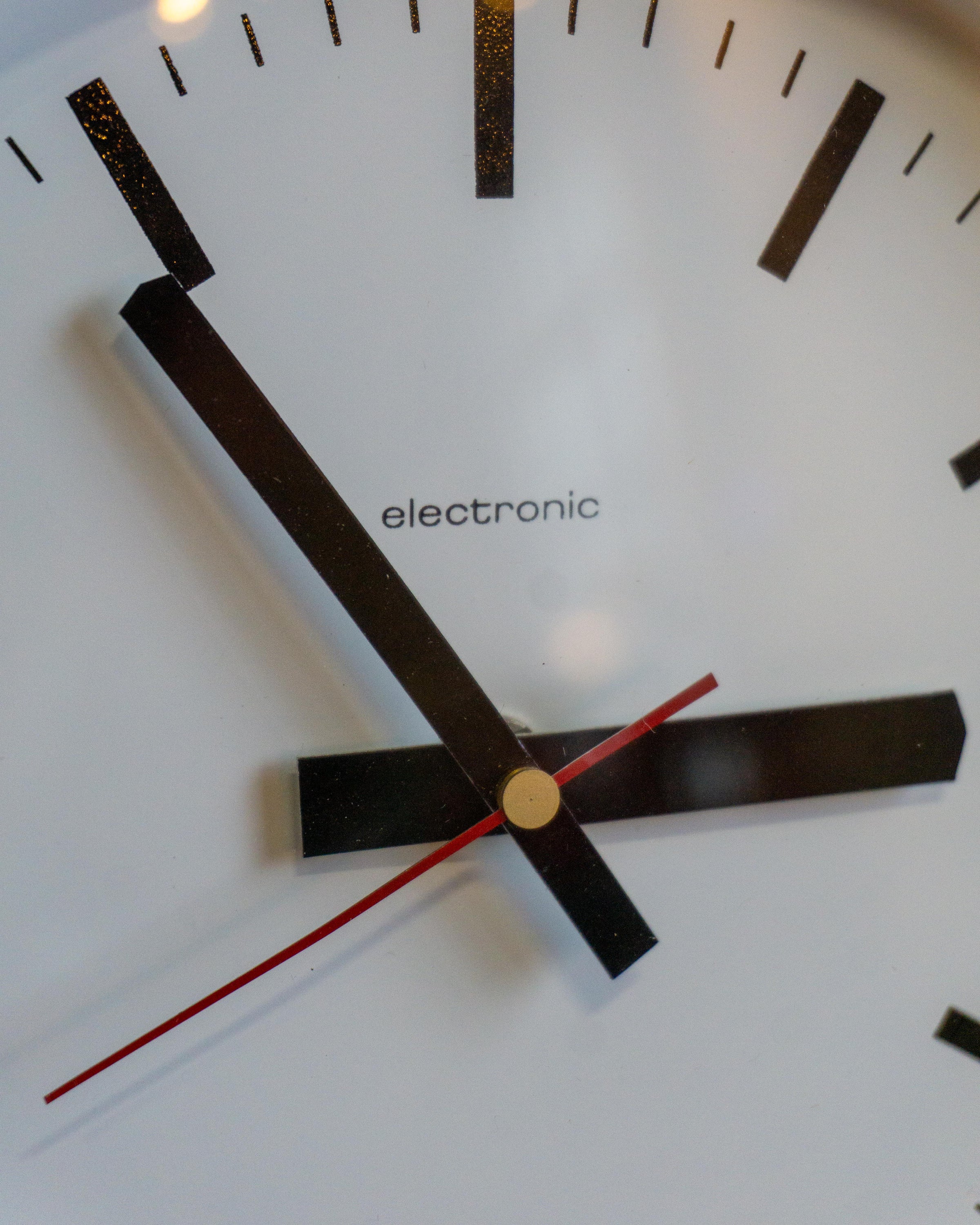 Orologio da parete Electronic originale degli anni ’80, realizzato in plastica color panna con quadrante lineare e design minimale. Tipico esempio di estetica funzionale del periodo, unisce semplicità formale e praticità d’uso.