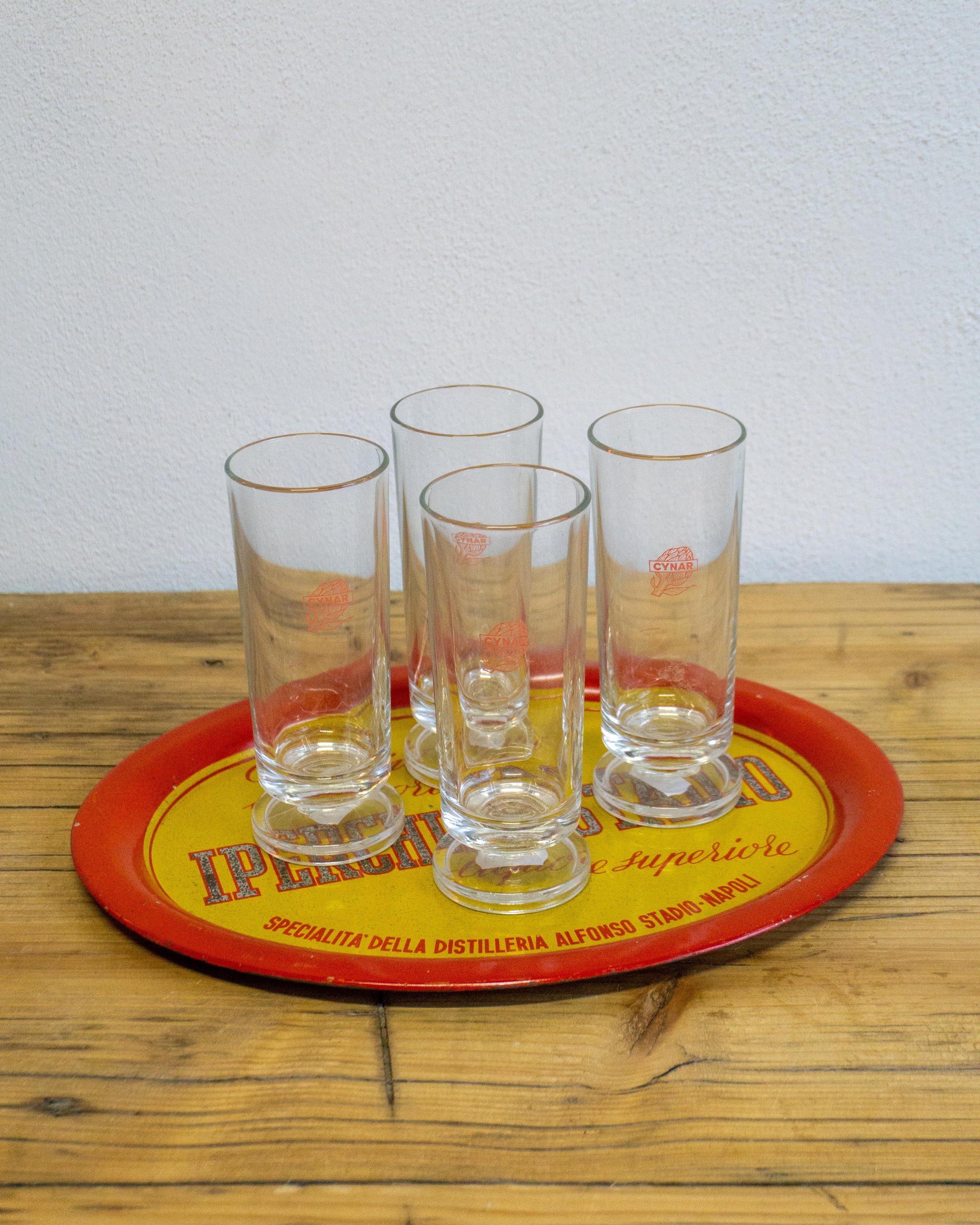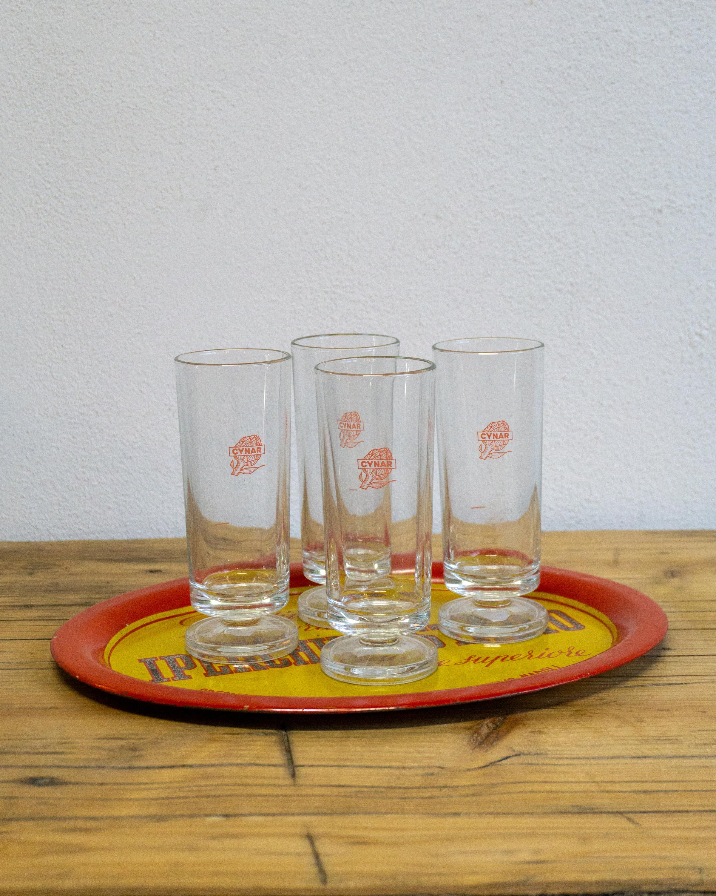 Set di quattro bicchieri pubblicitari Cynar con logo rosa serigrafato. Realizzati in vetro, rappresentano un classico oggetto promozionale da bar.