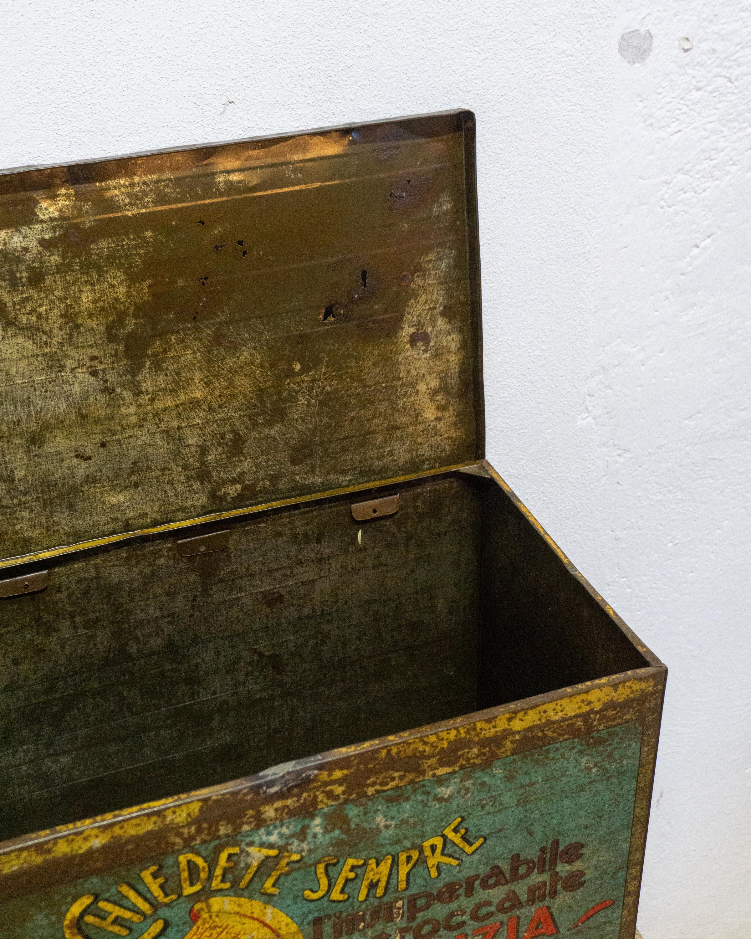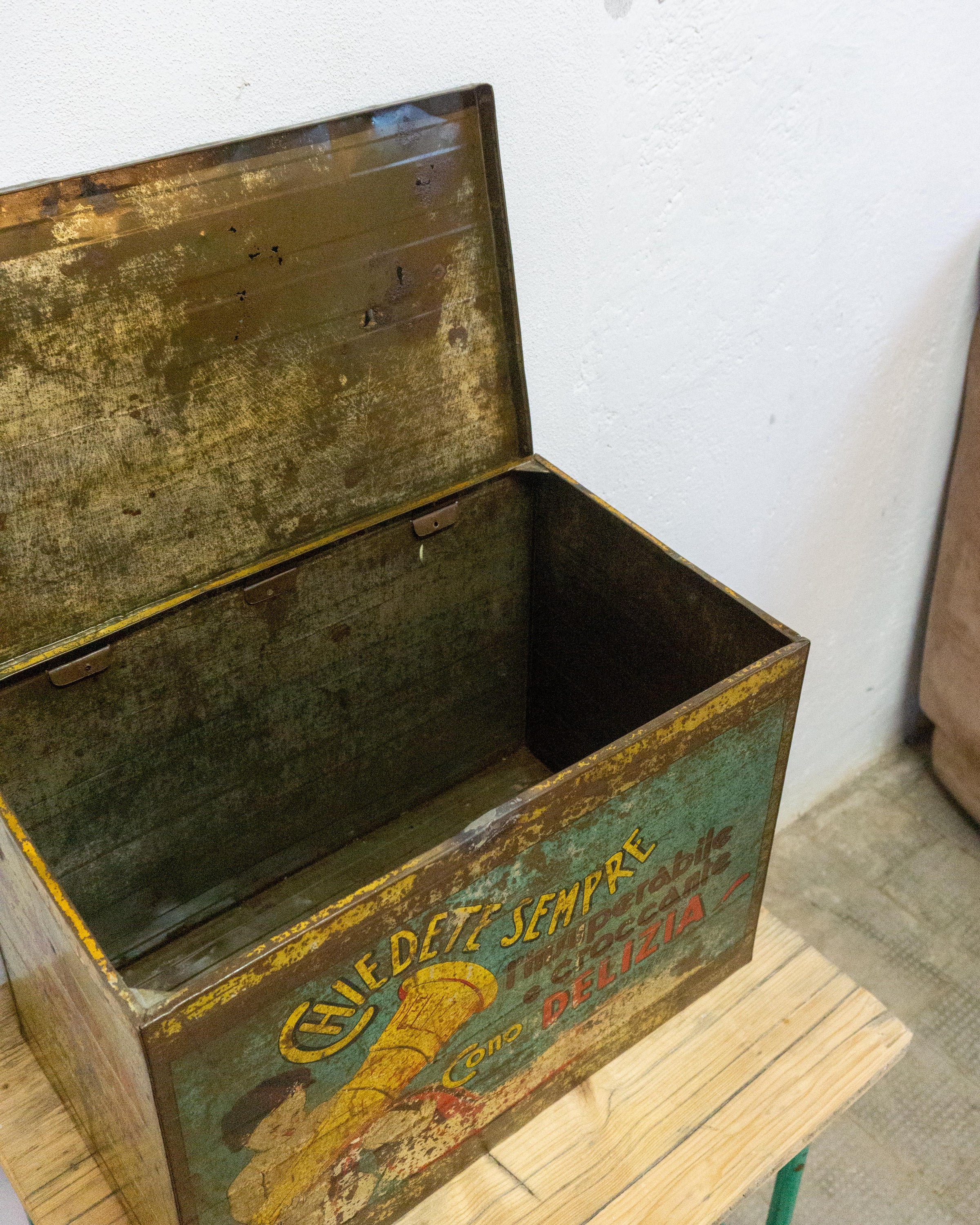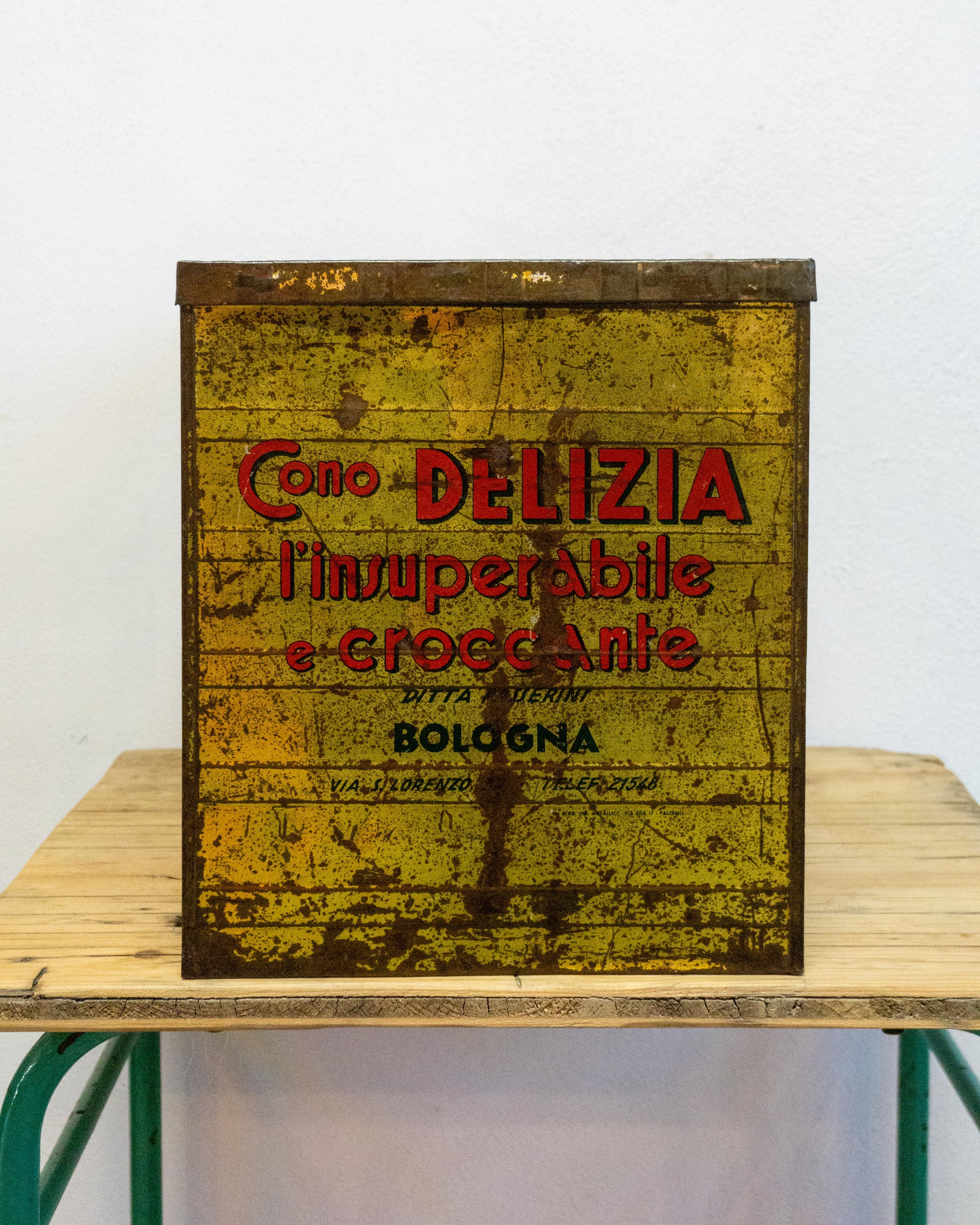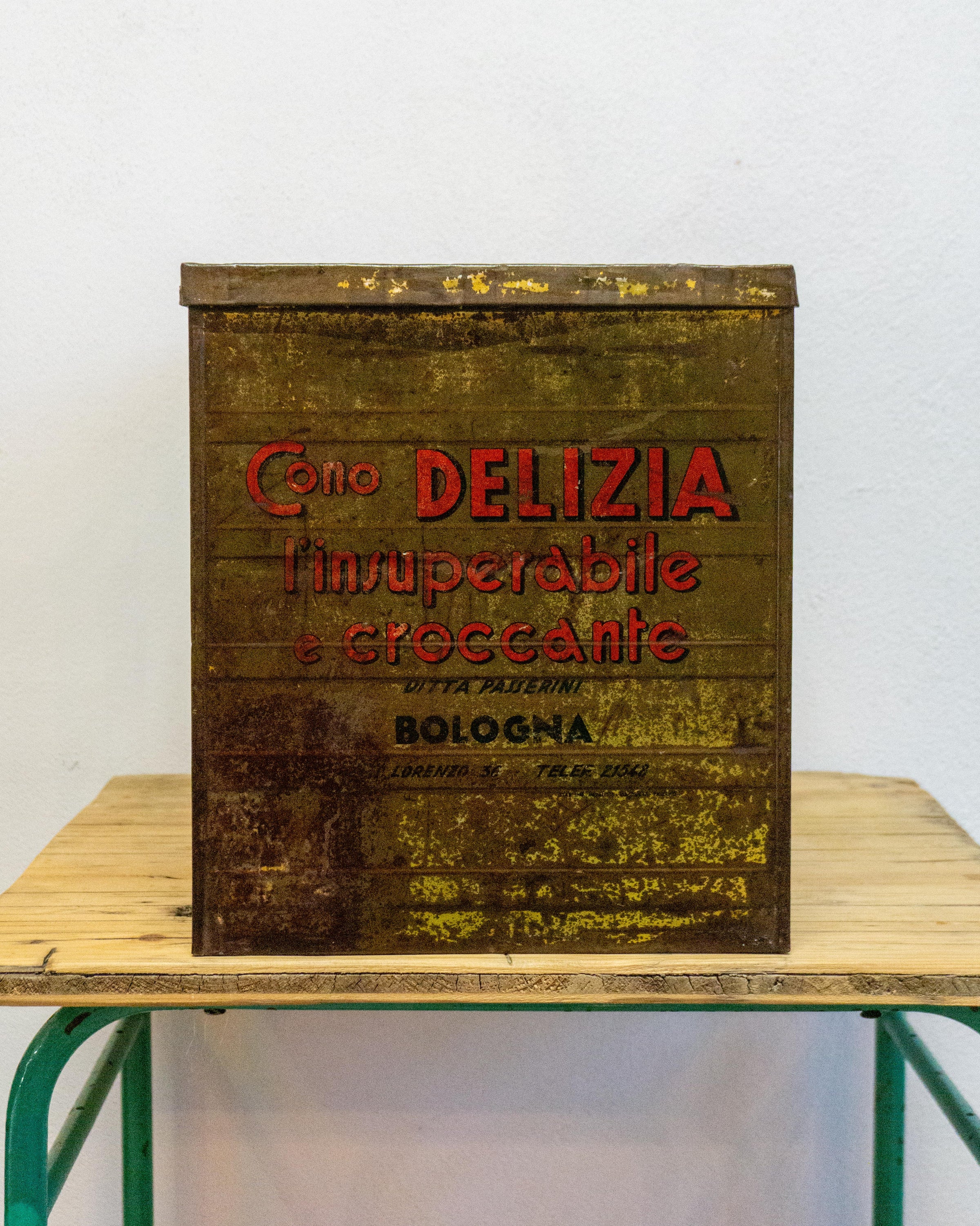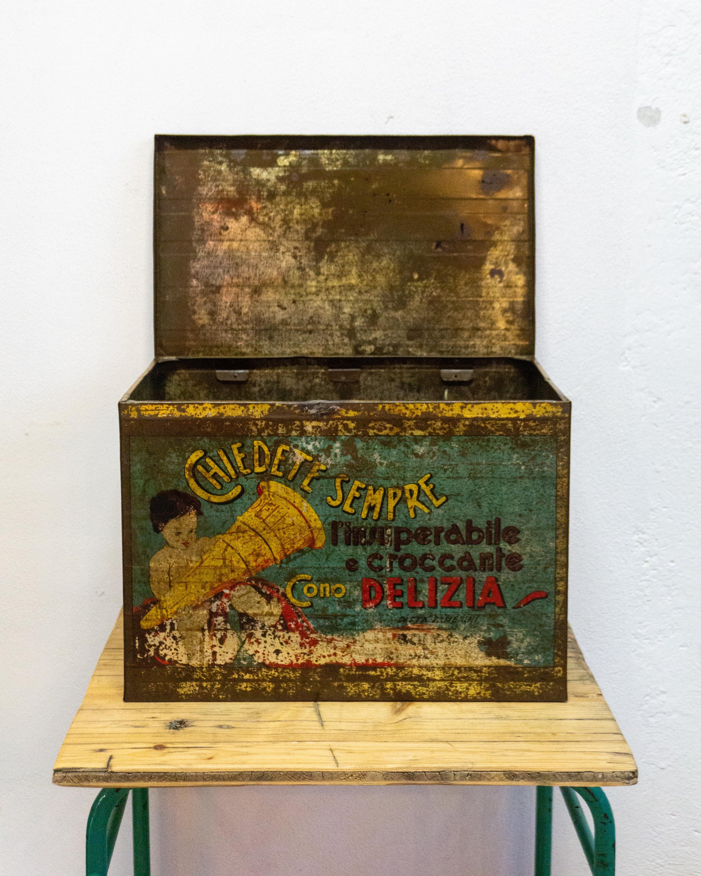 Scatola in latta Gelati Delizia Bologna, formato grande 30x50x35 cm. Grafica originale con segni del tempo che ne testimoniano l’autenticità.