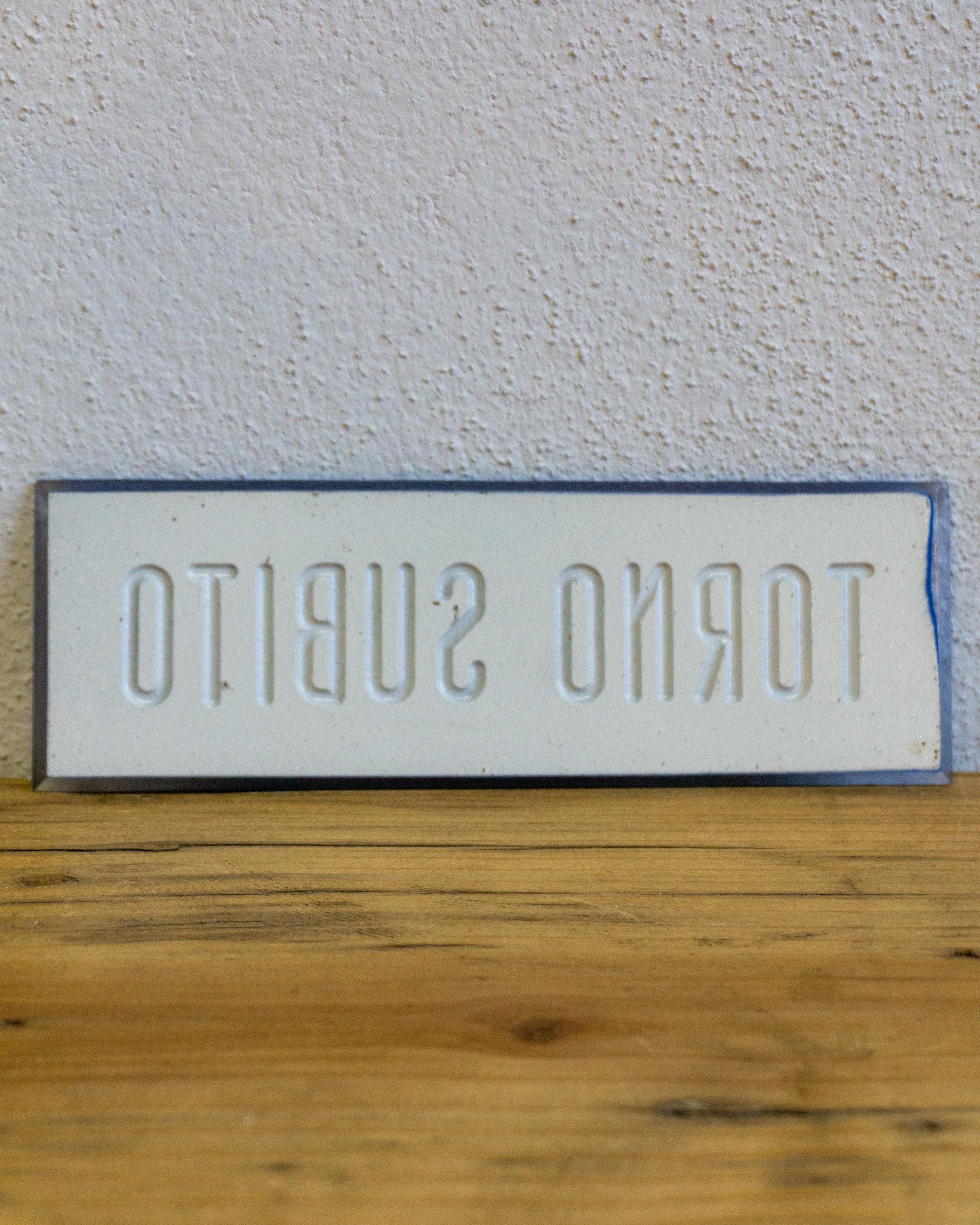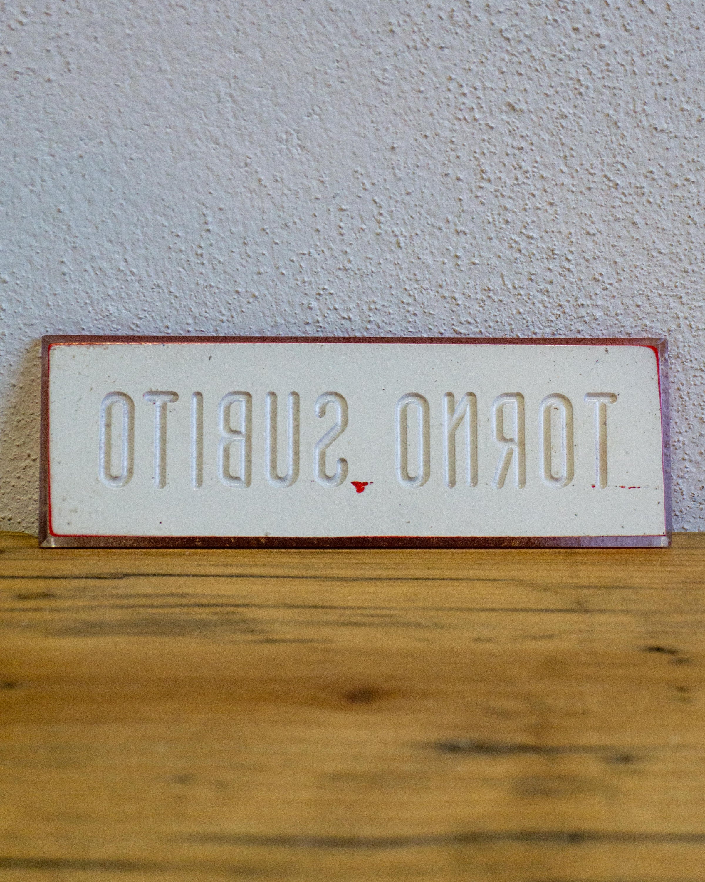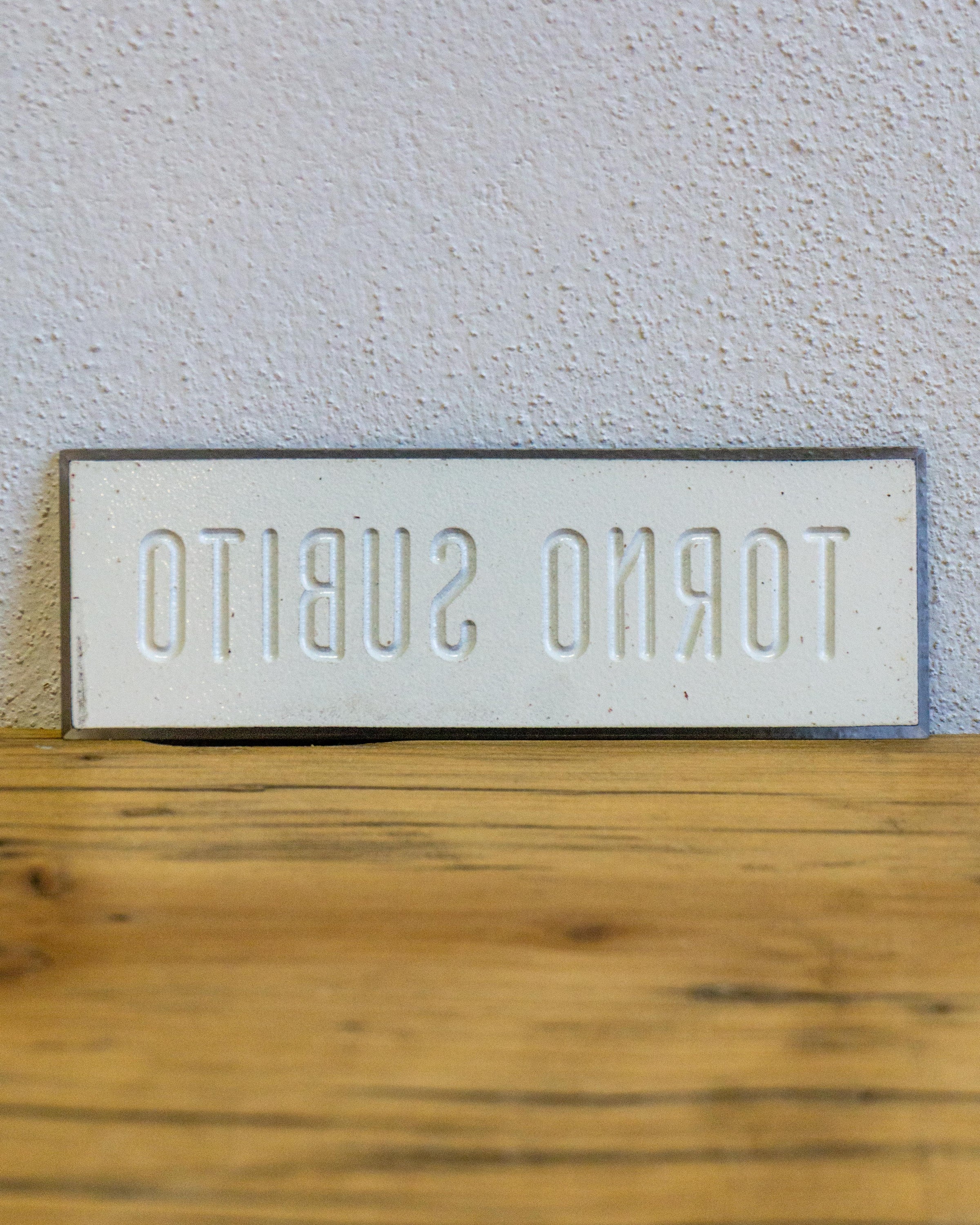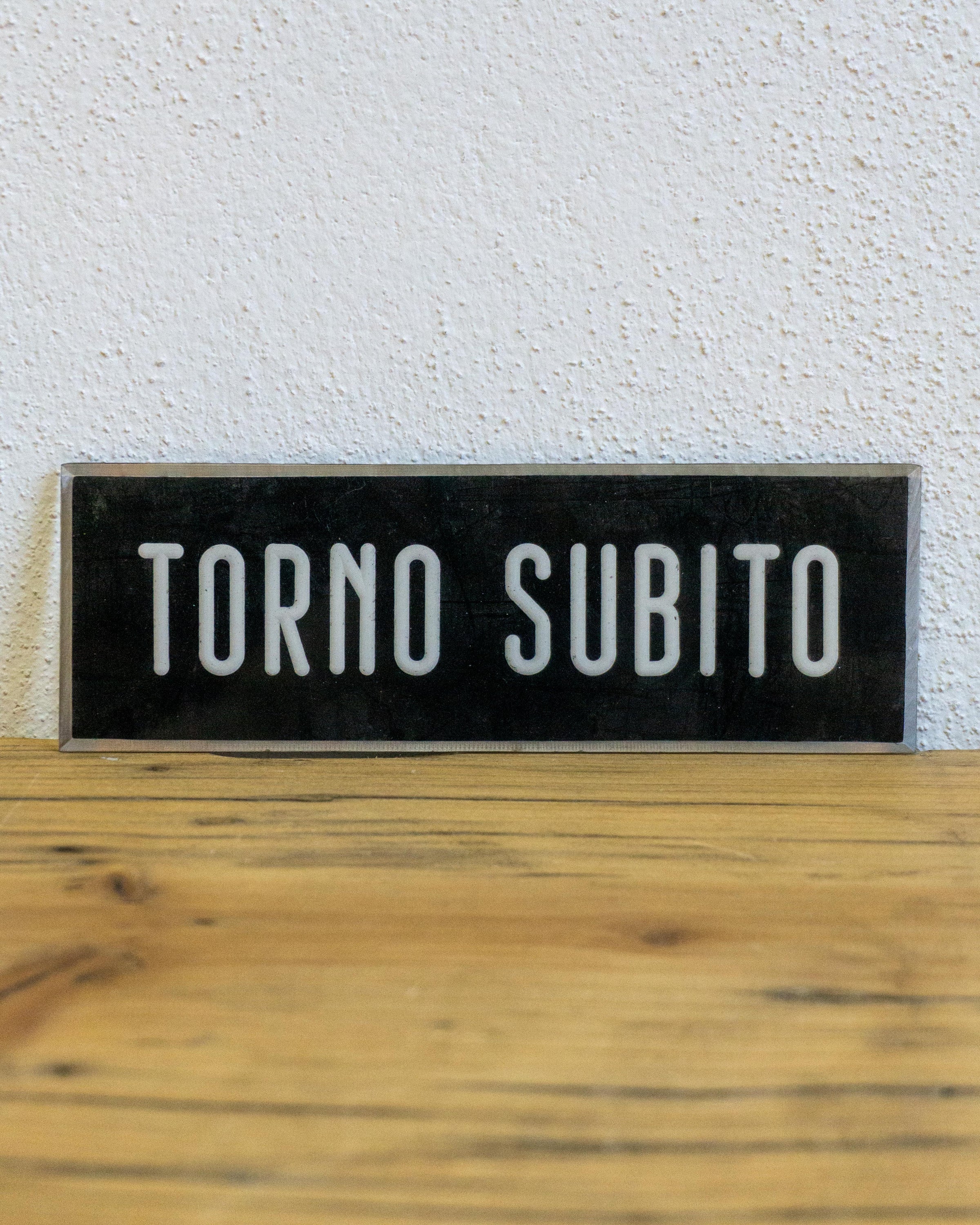Insegna “Torno Subito” originale italiana anni Ottanta in plastica incisa, 18×7 cm. Disponibile in diverse varianti colore, presenta i normali segni del tempo senza perdere leggibilità. Un autentico pezzo vintage, ideale per arredo, collezioni e allestimenti retrò.