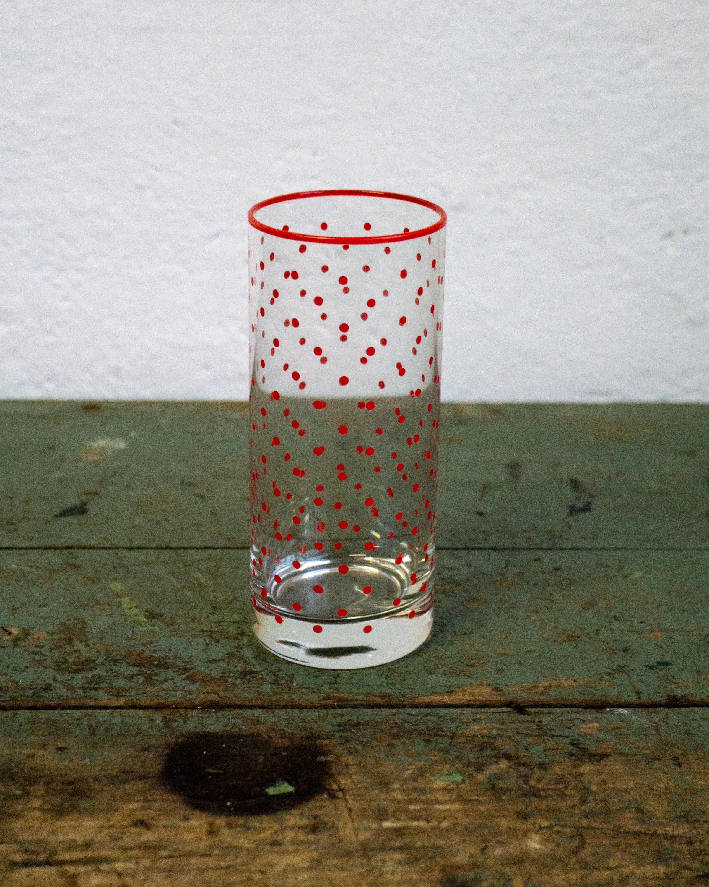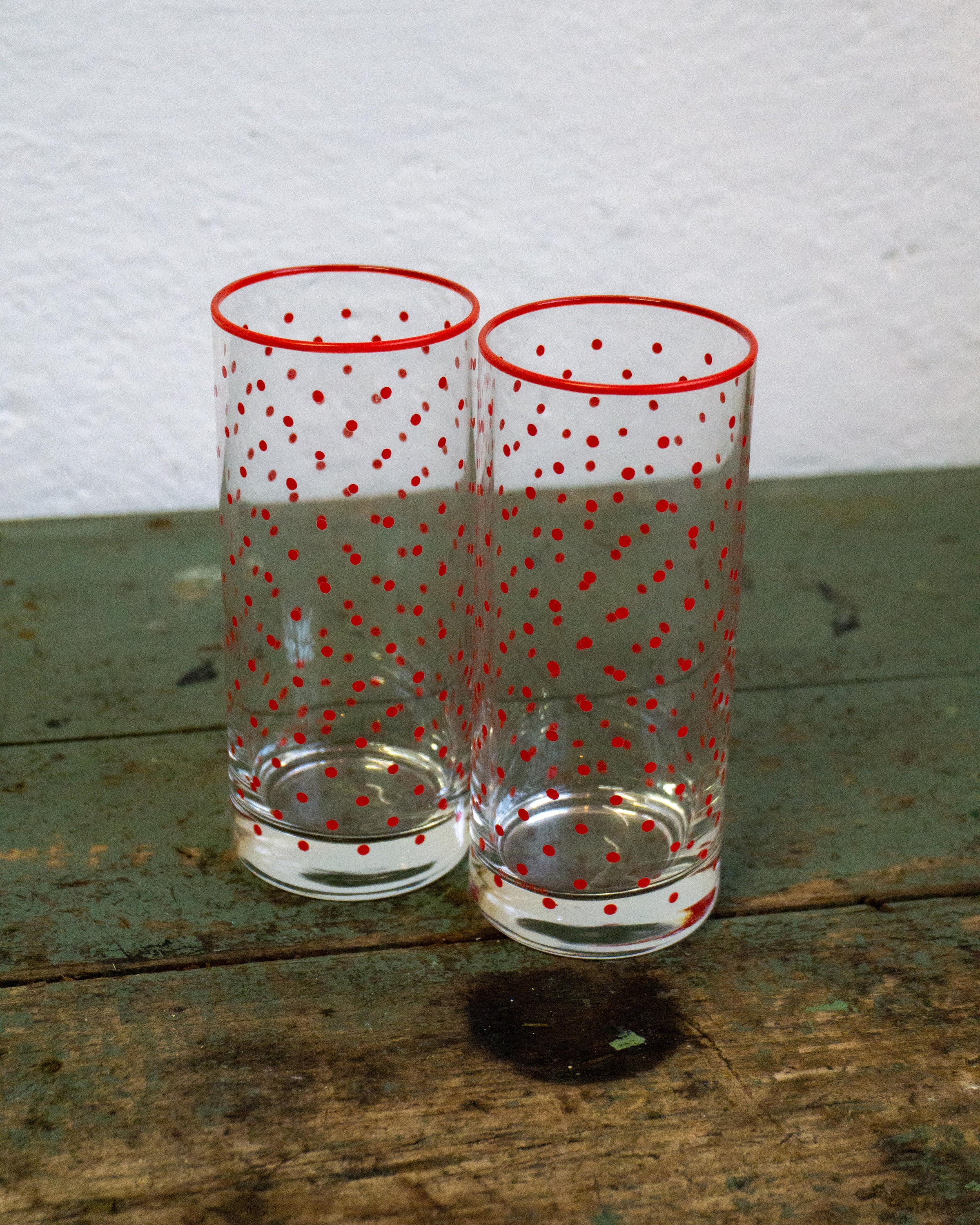 Set composto da 2 bicchieri in vetro decorati con motivo a pois rossi, databili agli anni Settanta. Esempio tipico di grafica domestica dell’epoca, vivace e riconoscibile. Il prodotto può presentare segni del tempo e dell’uso. Le immagini sono dimostrative e molto simili alla realtà, ma qualche dettaglio potrebbe essere sfuggito.