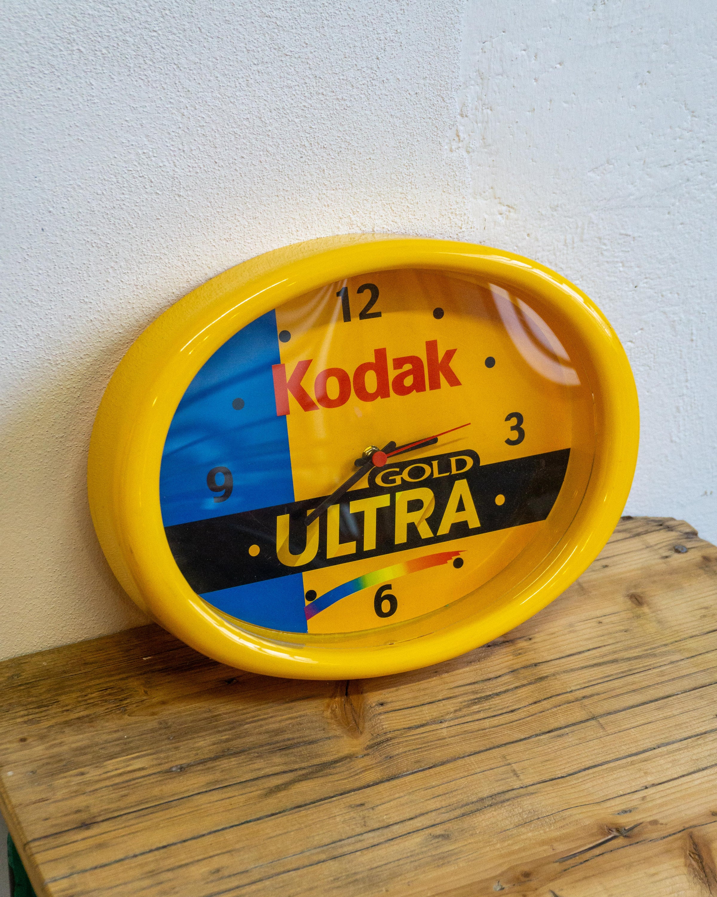 Orologio da parete promozionale Kodak Gold Ultra, realizzato negli anni ’90 come insegna pubblicitaria per punti vendita e laboratori fotografici. Struttura in plastica rigida con grafica originale Kodak e quadrante integrato. Misura 37 × 27 cm.