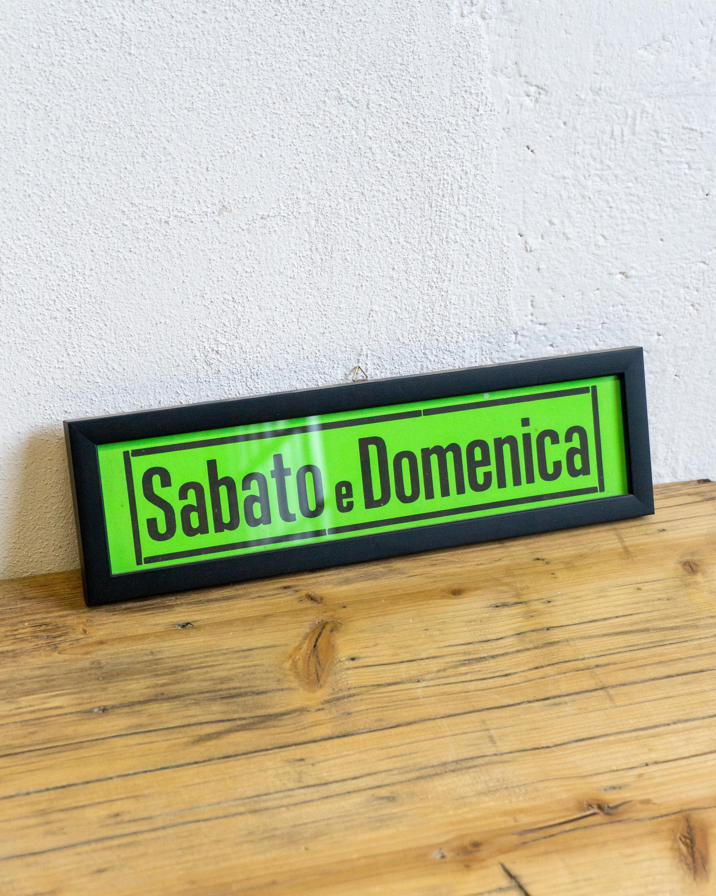 Insegna originale da cinema con la scritta “Sabato e Domenica”, proveniente da una sala cinematografica della Riviera Romagnola. Risalente agli anni ’70/’80, presenta fondo verde e lettering originale dell’epoca. È esposta in una cornice in legno con vetro protettivo realizzata su misura da una corniciaia. Un pezzo autentico della segnaletica cinematografica italiana, ideale per collezionisti o come elemento d’arredo dal fascino vintage.