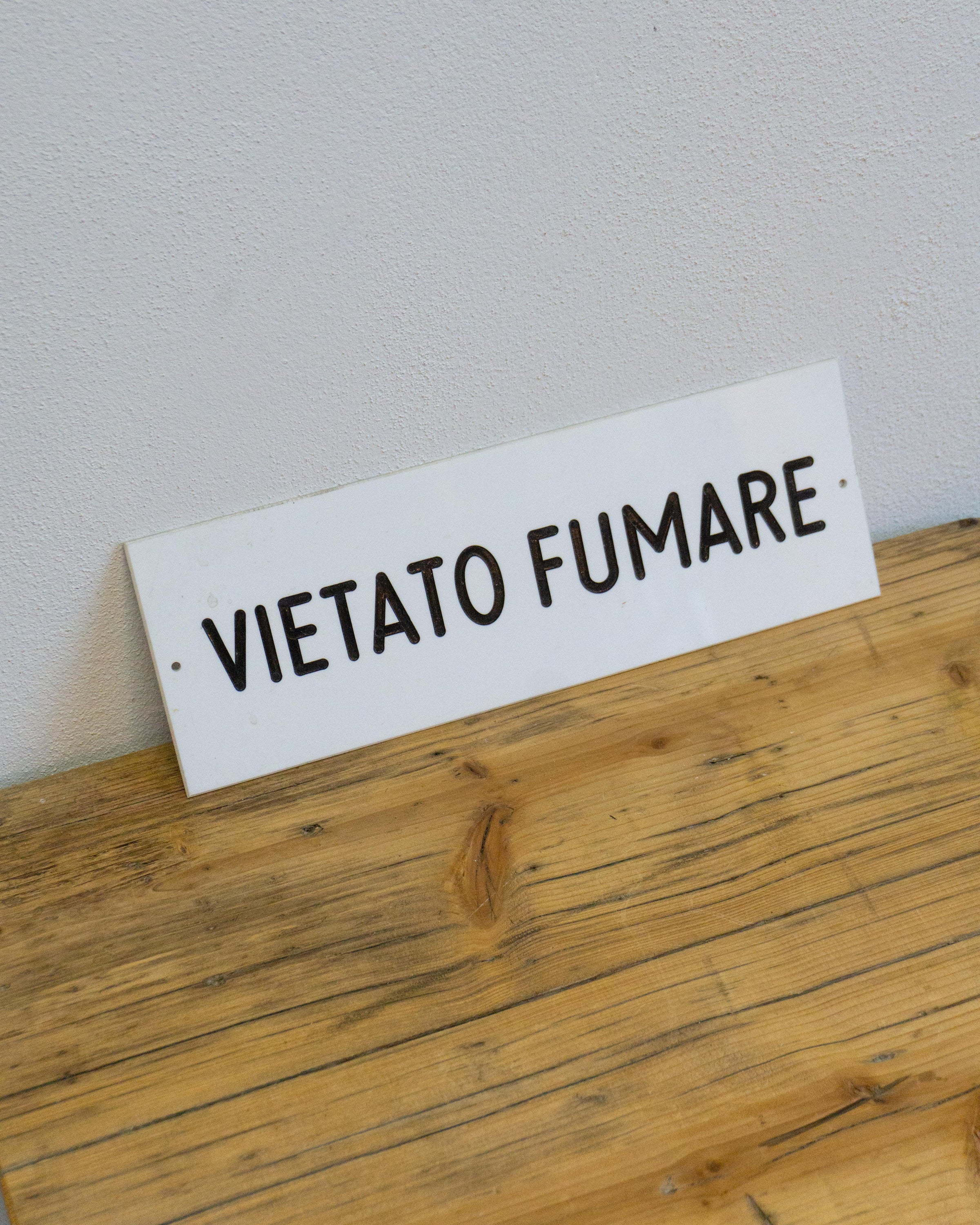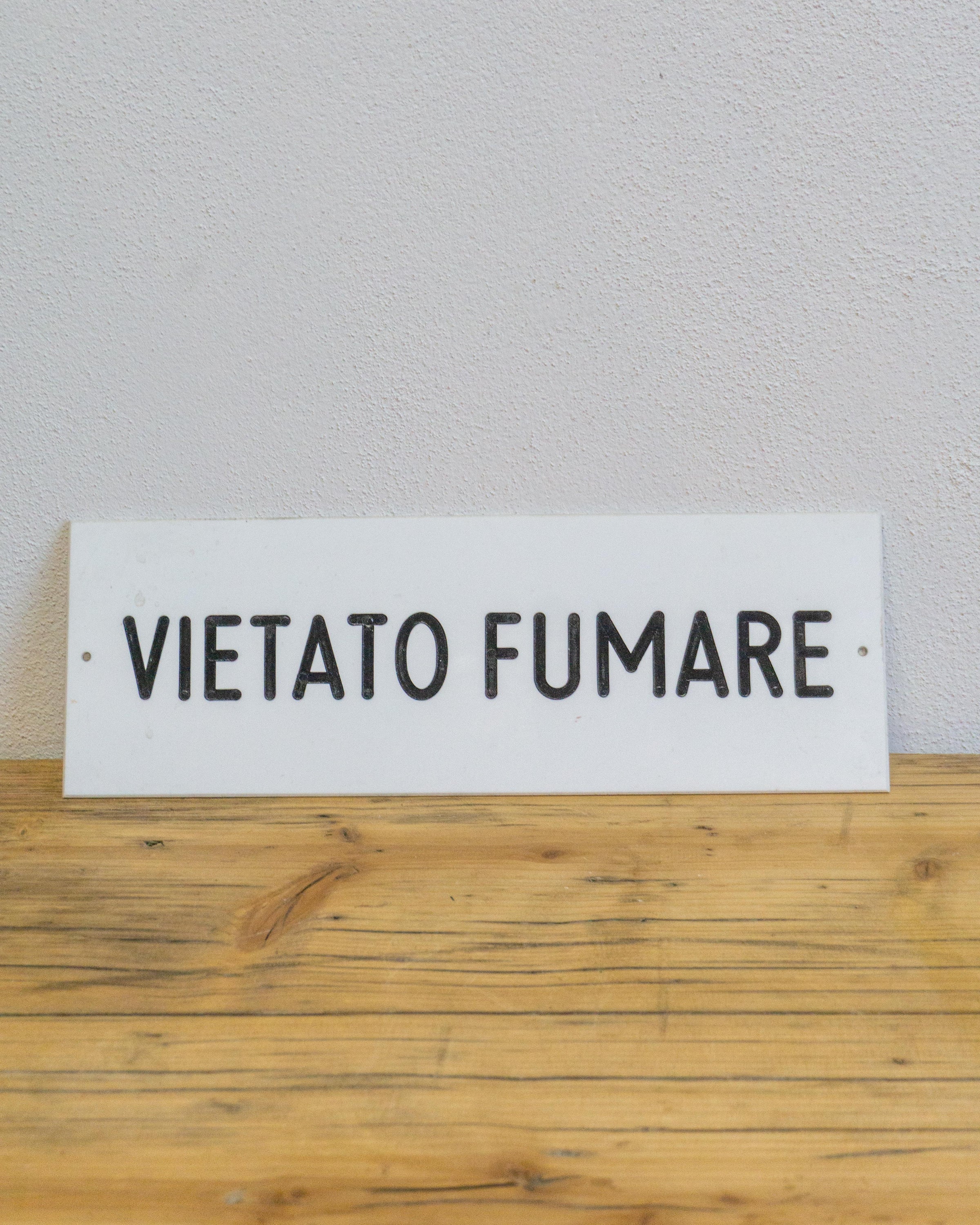 Insegna “Vietato Fumare” in plastica, dimensioni 35x12 cm. Oggetto originale da ambiente pubblico, con grafica semplice e immediata tipica del periodo.