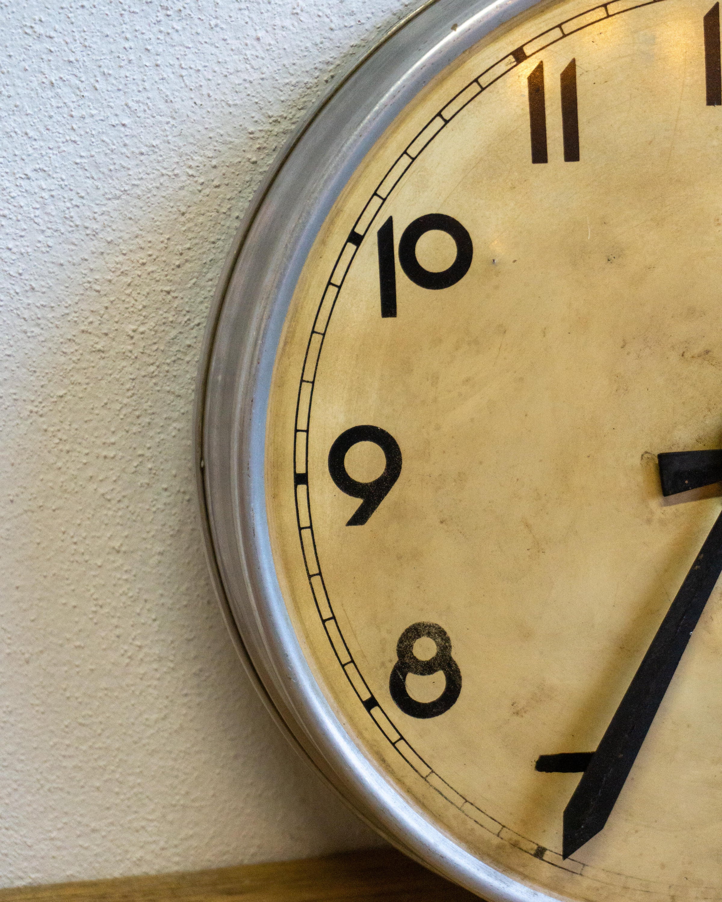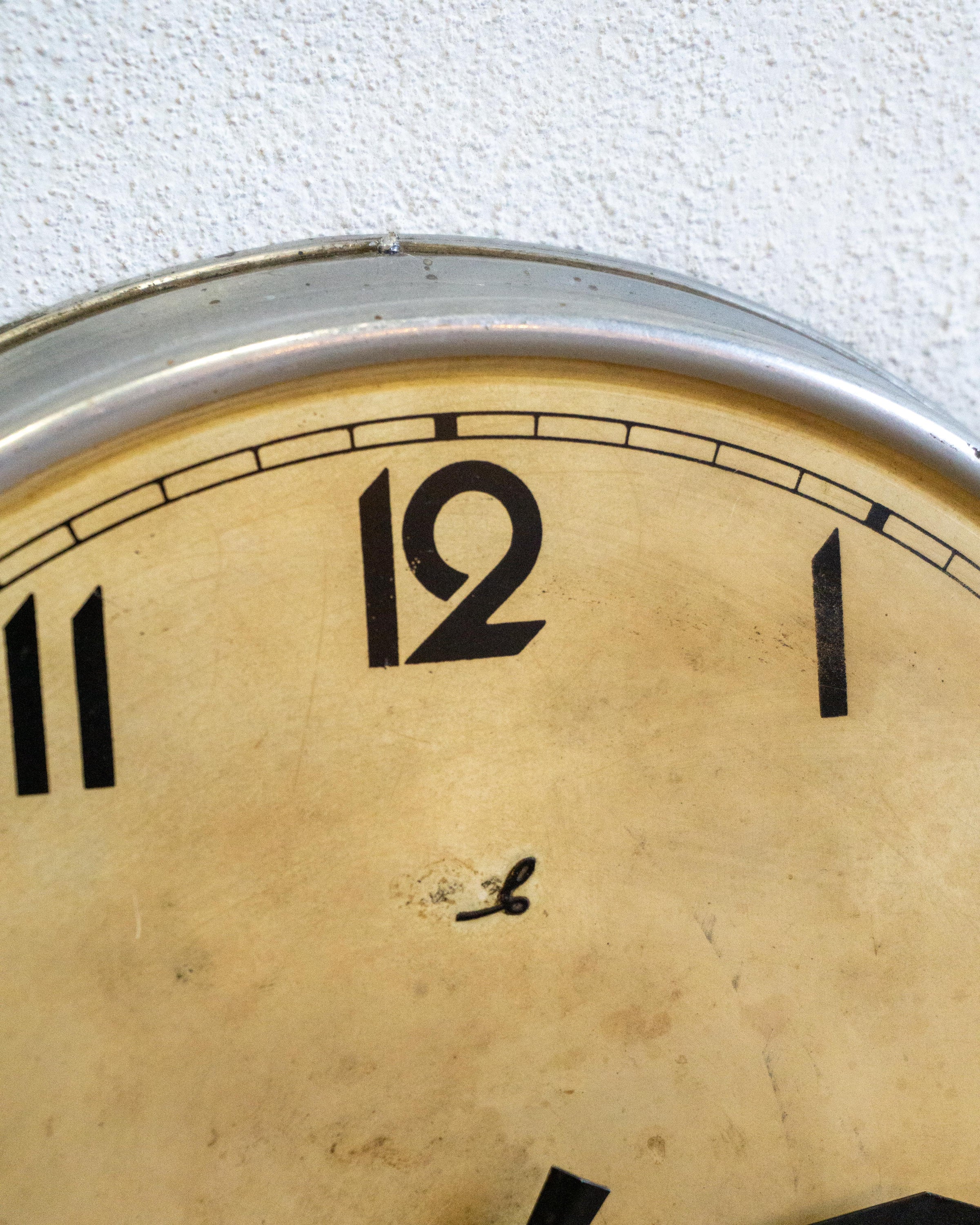 Orologio da parete sovietico originale, realizzato in metallo/alluminio con finitura satinata e quadrante dal design industriale. Misura 29 cm di diametro. Prodotto negli anni ’70, rappresenta un perfetto esempio di estetica funzionale tipica dell’Europa dell’Est del periodo.