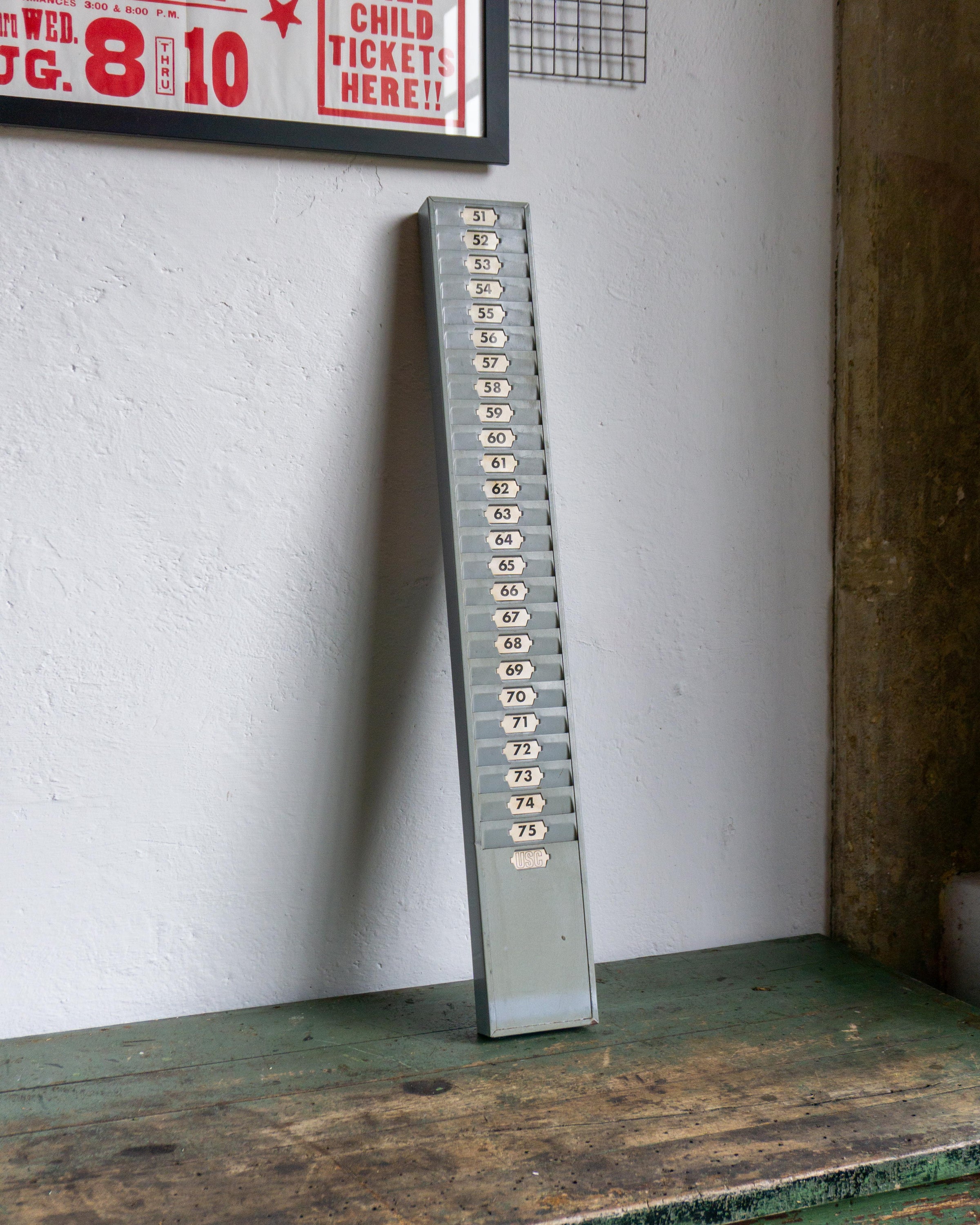 Porta cartellini industriale da lavoro, struttura metallica, dimensioni 95x13 cm. Oggetto funzionale proveniente da contesti produttivi, oggi apprezzato come elemento decorativo in ambienti industrial o vintage. Il prodotto può presentare segni del tempo e dell’uso. Le immagini sono dimostrative e molto simili alla realtà, ma qualche dettaglio potrebbe essere sfuggito.