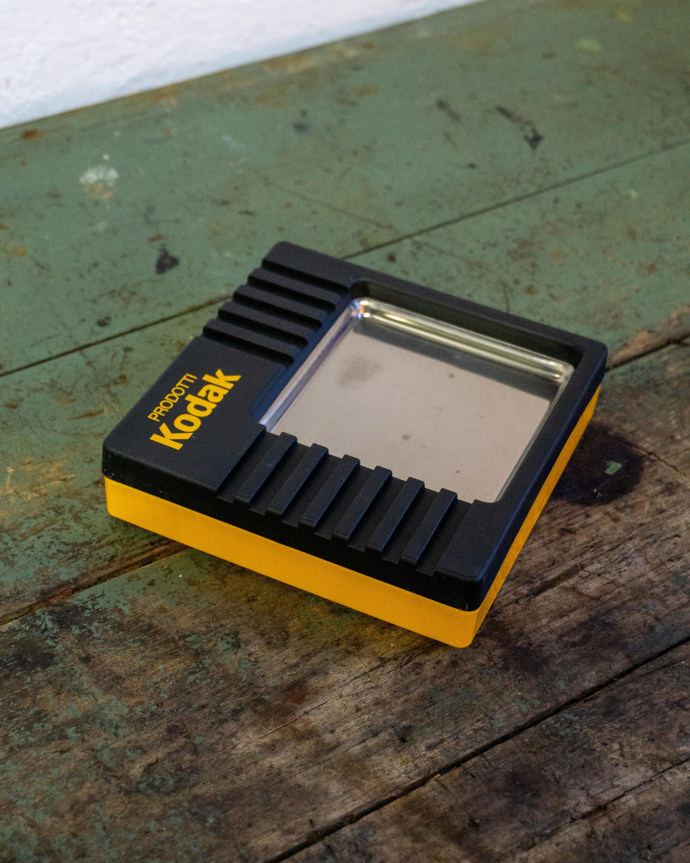 Portacenere Kodak anni Ottanta, fondo di magazzino, realizzato come gadget promozionale. Dimensioni 14x14 cm. Oggetto pubblicitario originale, non destinato alla vendita al pubblico all’epoca. Il prodotto può presentare segni del tempo e dell’uso. Le immagini sono dimostrative e molto simili alla realtà, ma qualche dettaglio potrebbe essere sfuggito.