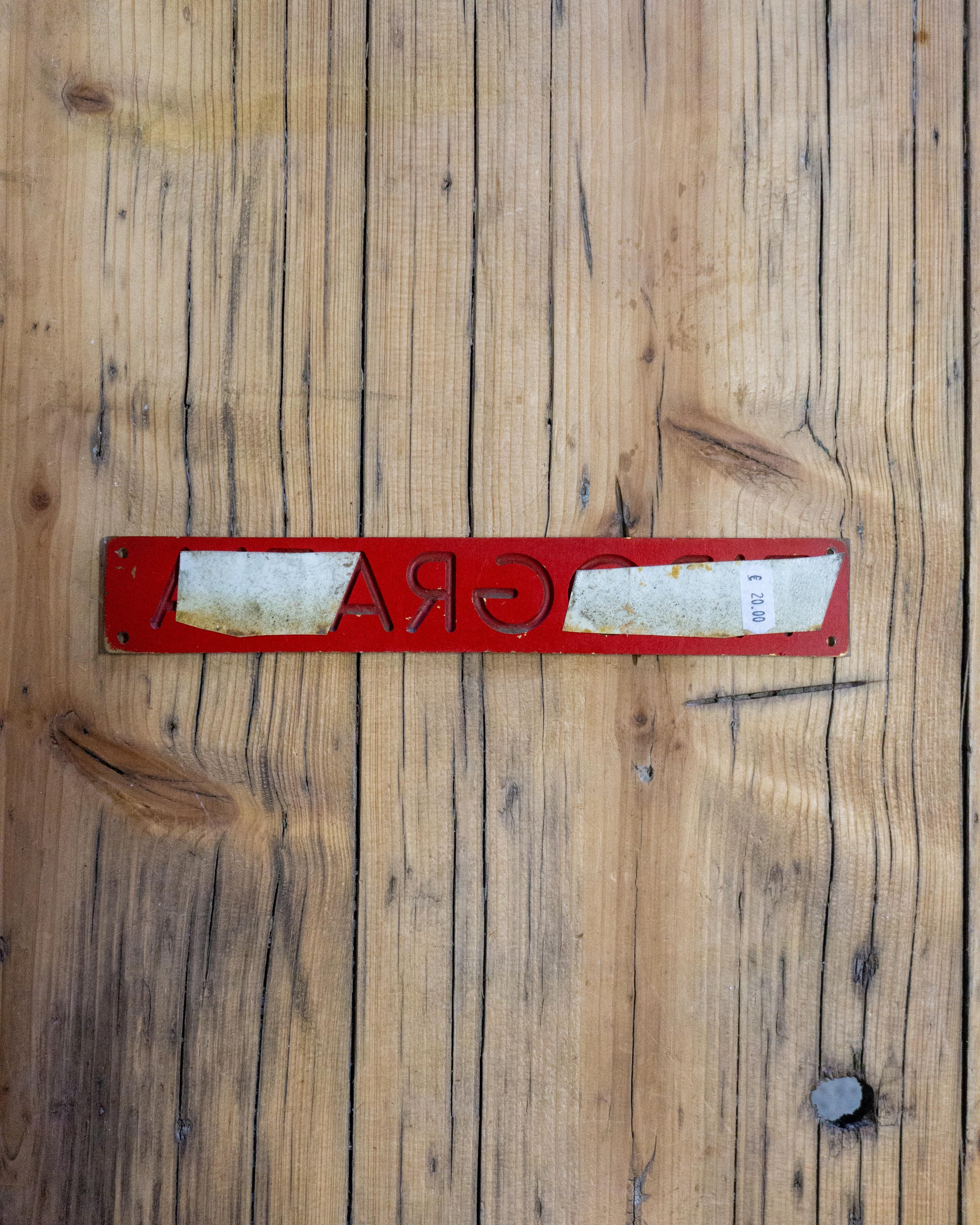 Realizzato in metallo, con caratteri incisi tipici delle insegne da laboratorio di stampa.