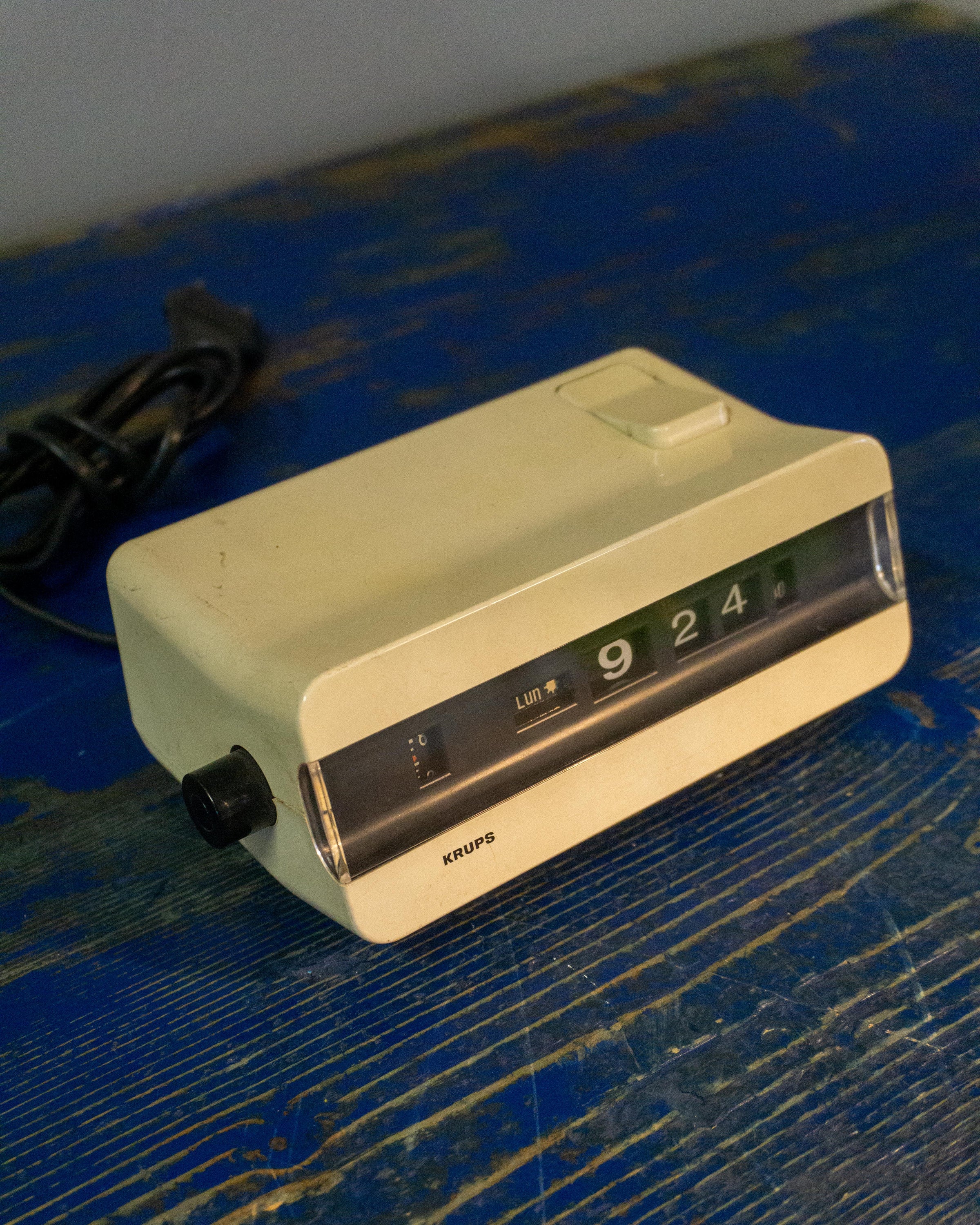 Orologio da comodino Krups originale degli anni ’70, modello a cartellini flip flap con scocca in plastica color panna. Misura 17 × 8 × 10 cm. Icona del design modernista del periodo, unisce estetica pulita e meccanica di precisione tipica della produzione tedesca.