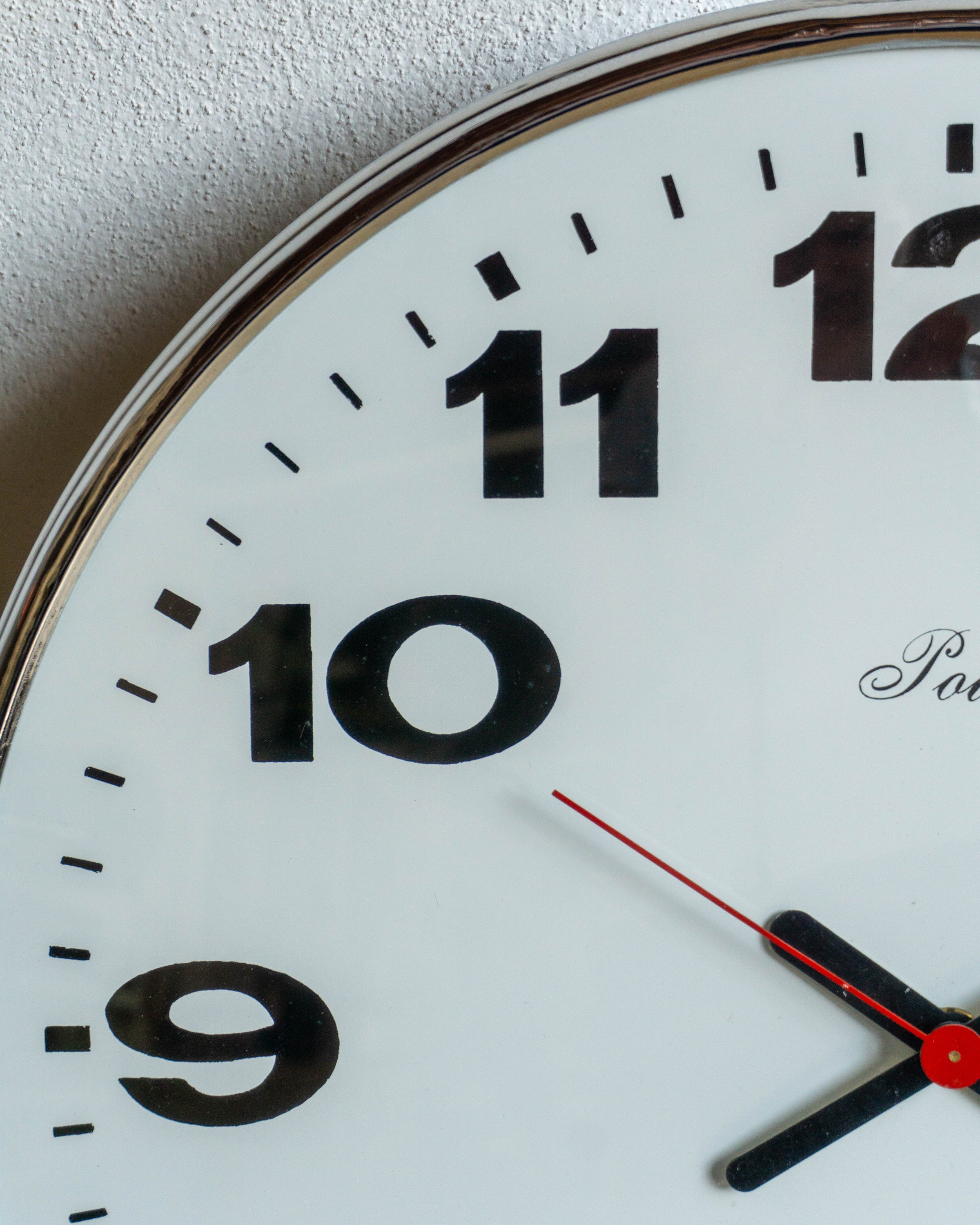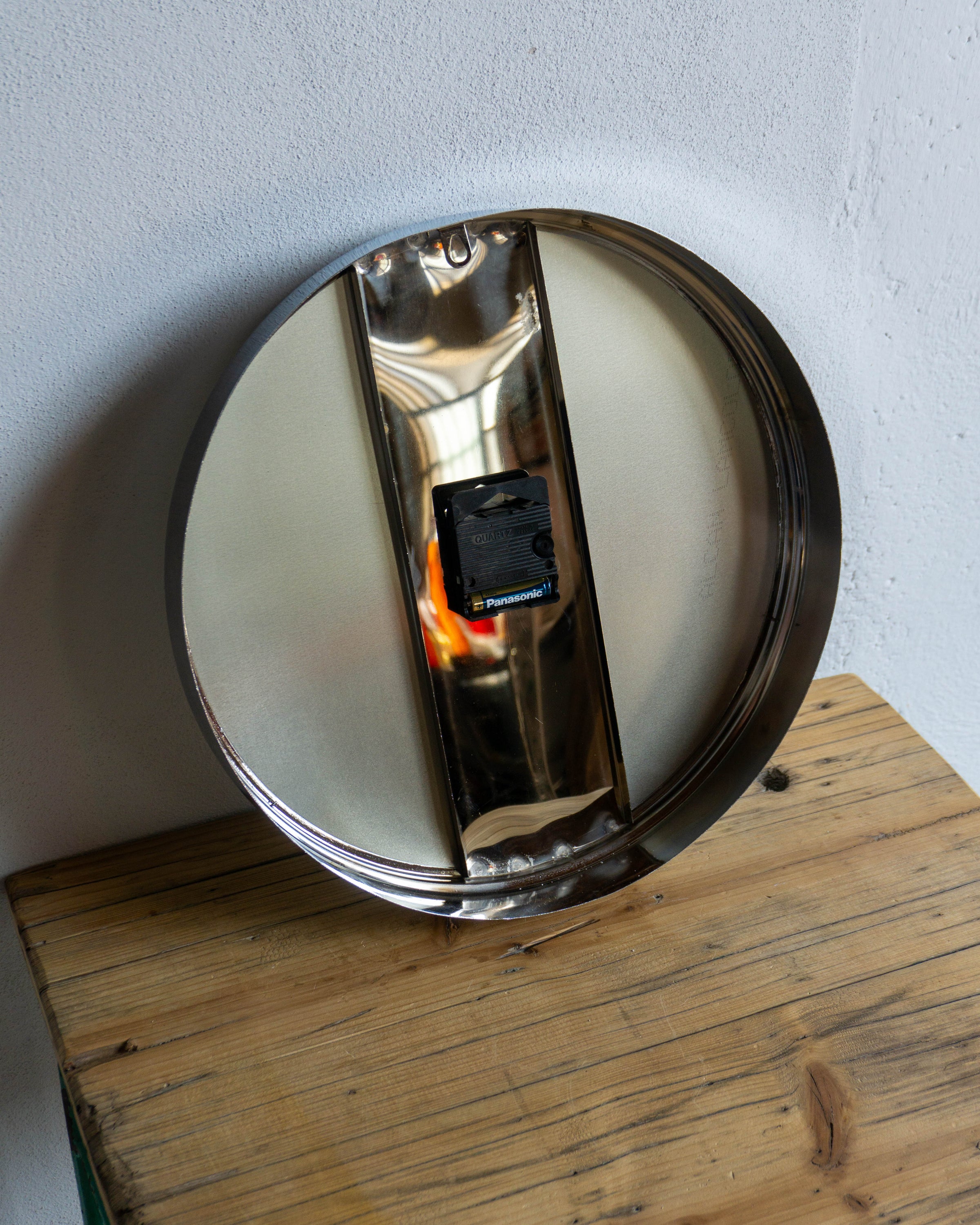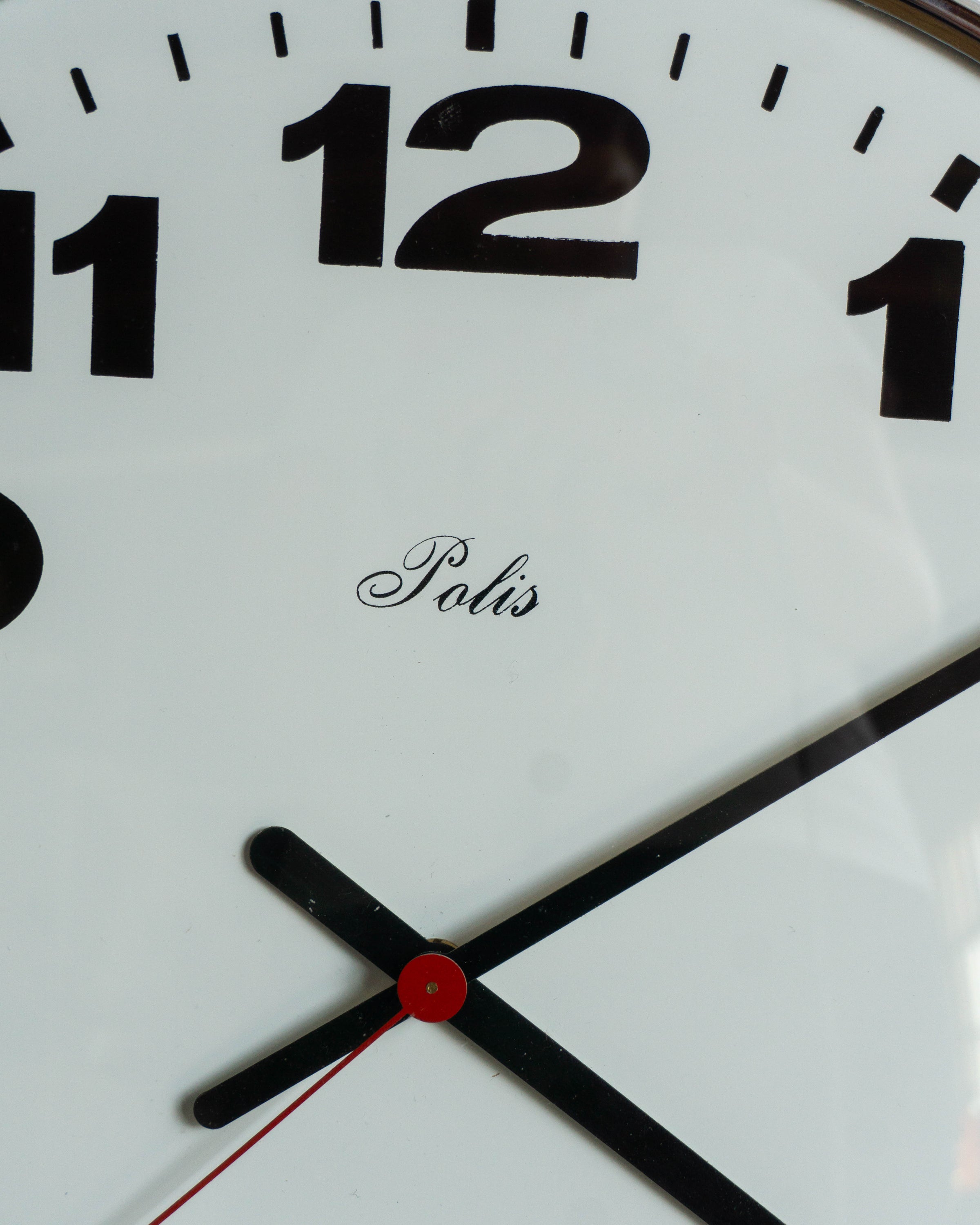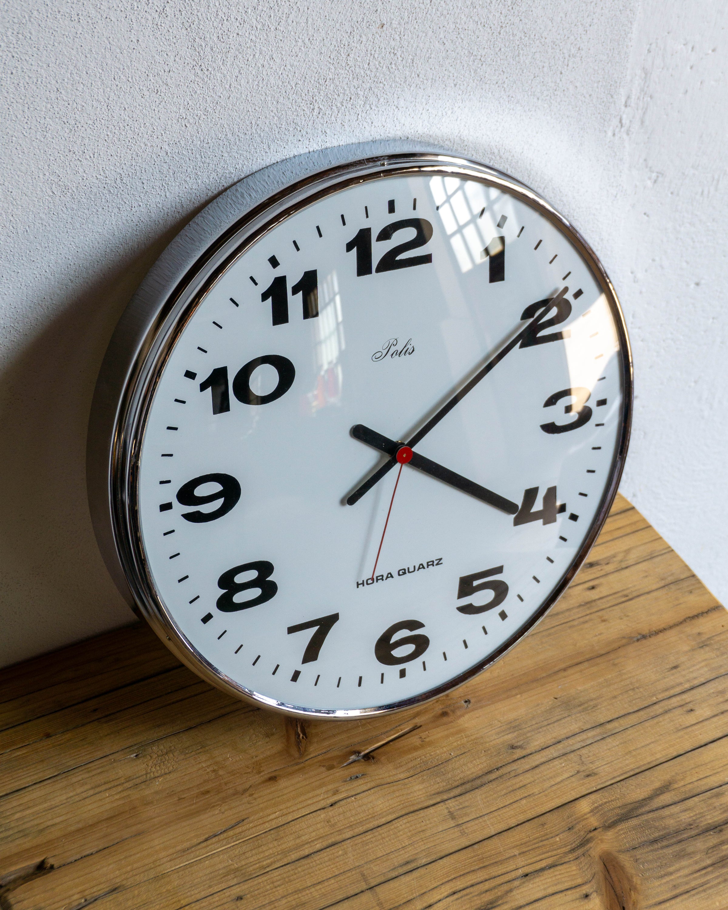 Orologio da parete POLIS, originale d’epoca, con elegante forma tonda (Ø 38 cm), pensato per scuole, uffici e ambienti professionali tra anni ’70 e ’80.